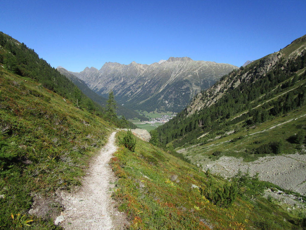 Pobeh mám naplánovaný tak aby som čo najviac nových vecí videl a prešiel a tak hneď na začiatku zamierim chodníčkom v krásnom smrekovcovom lese do ústia Val Champagna. Táto dolina ktorú je z údolia v smere od Samedanu veľmi dobre vidieť zatiaľ odolávala mojim výletom.
