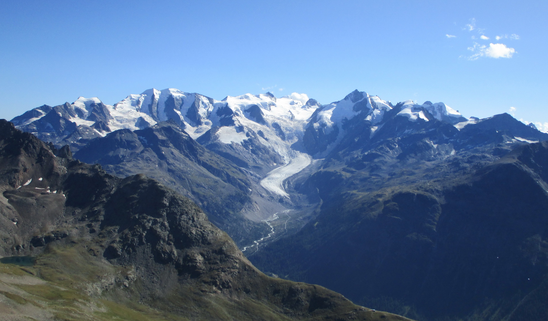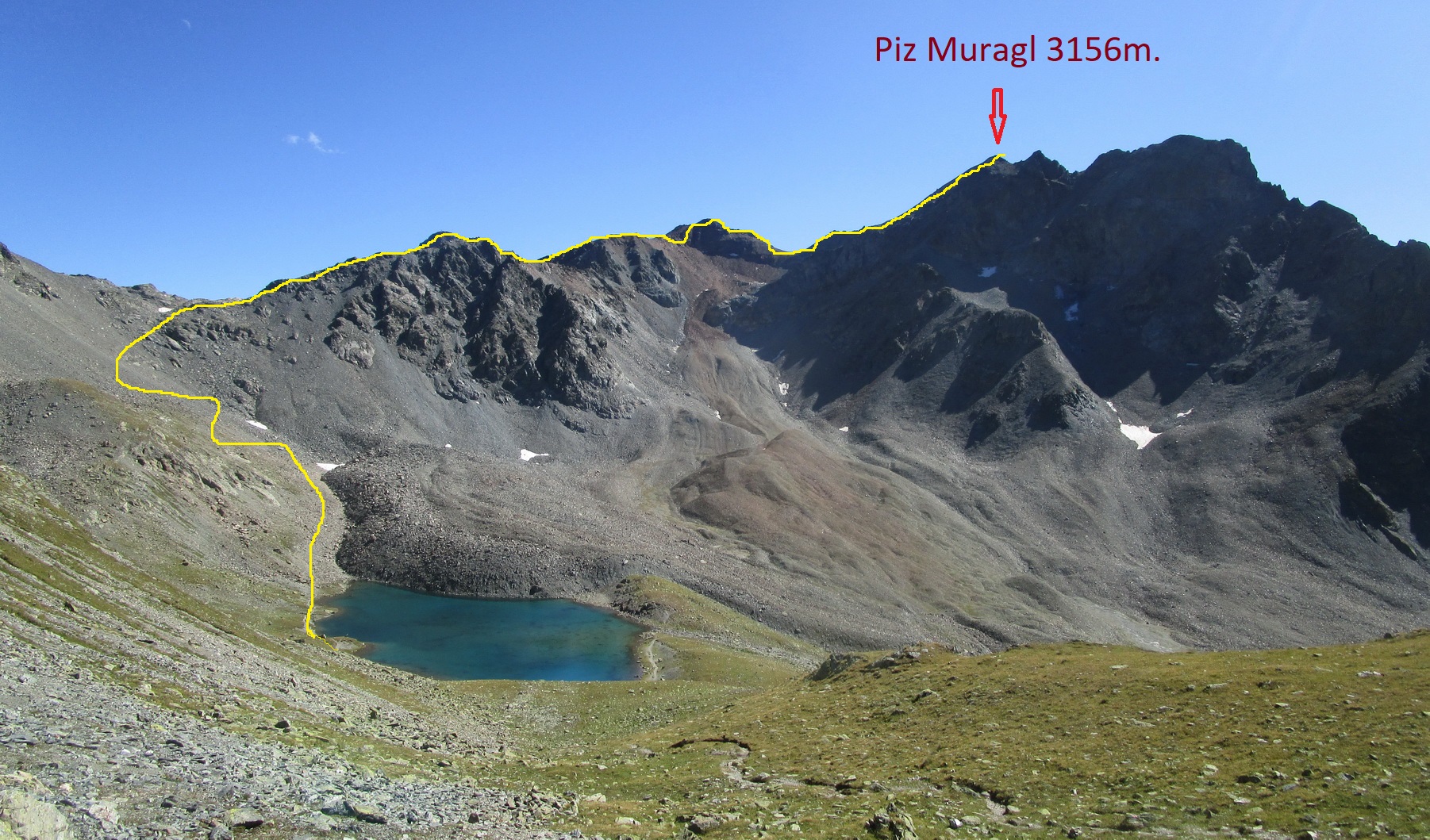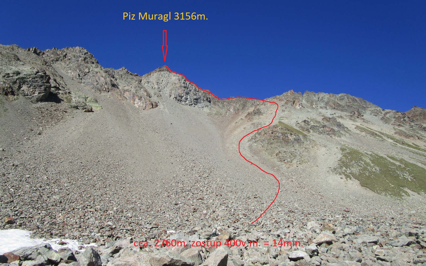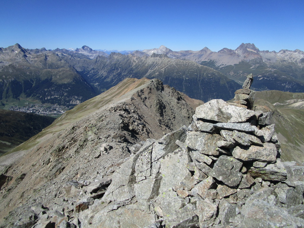 Obehnem zopár postarších Švajčiarov, vypočujem si nejaké tie závistlivé poznámky a potom sa znovu ocitám v teréne mimo značiek a mimo ľudí. Vo Fuorcla Muragl schádzam zo značky a hrebeňom si to namierim na Piz Clux. Terén ma celkom púšťa, postupujem rýchlo a o chvíľu si už fotím výhľady z vrcholu. Odtiaľto ma čaká hrebeň na Piz Muragl. Opäť sa zadarilo aj keď trebalo aj popoliezať a z Muraglu sa teším super výhľadom. Na tomto kopci som už bol aj dvakrát v zime. Je známy svojími úžasnými výhľadmi na Berninské Alpy.