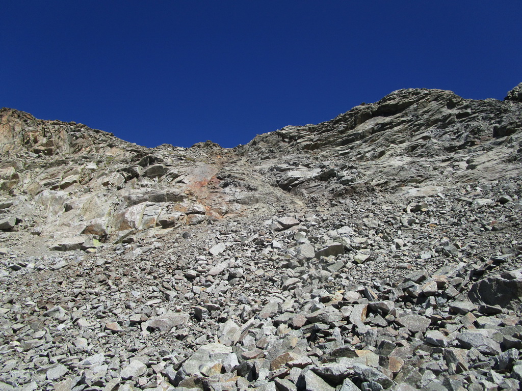 Výstup do Fuorcla Burdun je celkom zaujímavý. Ľahké lezenie, voľné kamene. Je mi jasné, že dole to tadiaľto nepôjde. Aj preto v sedle venujem dostatok času na prieskum terénu v prípade môjho návratu týmto smerom.
