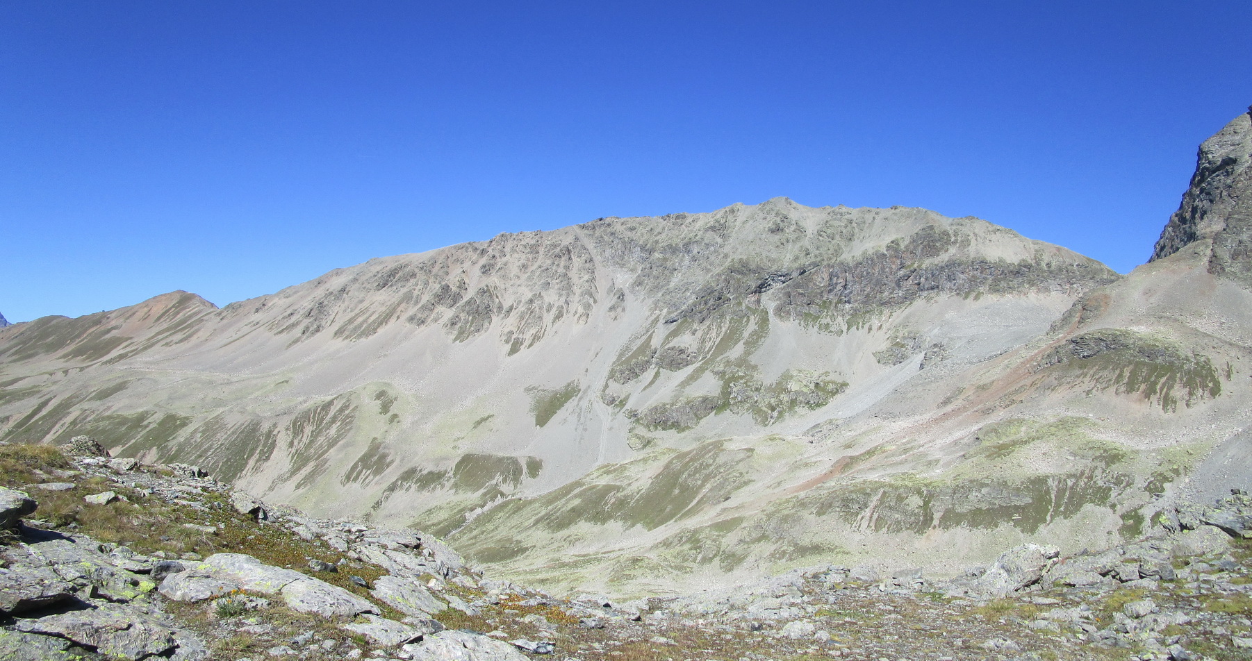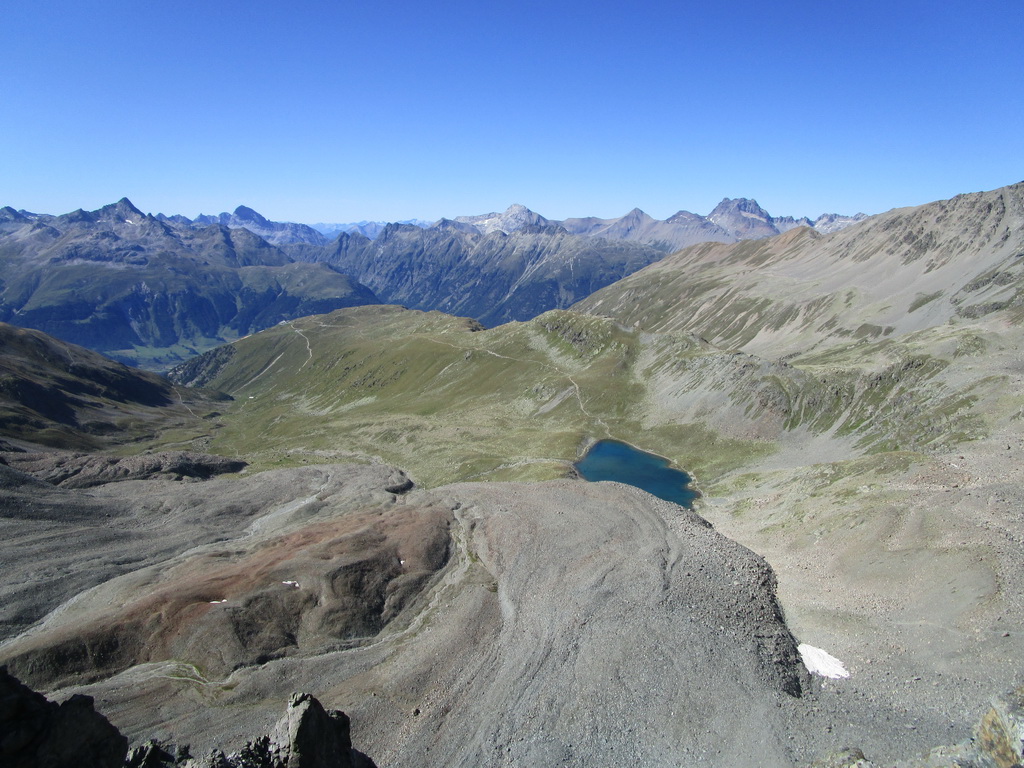Po prekvapivom náhodnom stretnutí sa otáčam a vraciam sa naspäť hrebeňom spolu s Borisom. Pri zostupe z Fuorcly Burdun sa stretávame s trošku zložitejším terénom s voľnými kameňmi, ináč pohoda. Zostúpime spolu do Val Champagna, Boris sa vracia dolinou dole, doma už ho čaká rodinka a ja pokračujem ďalej na poobedňajší program.
