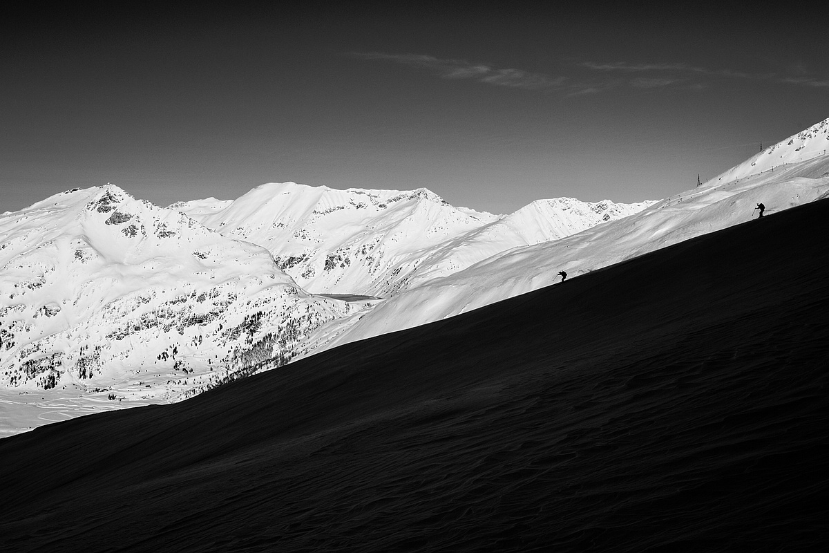 Nečudo, že boli moje očakávania na sobotu vysoké. Relatívne lepšia predpoveď s dobrou viditeľnosťou, no silnejúcim vetrom a pretrvávajúcou lavínovou trojkou si žiadala skúseného lokálneho borca. Jarouš teda vyberá Silberpfennig. Túra na kopec oproti Kalbretterkopfu s možnosťou lyžovania inou trasou Angertalom. Pridáva sa k nám parťák z Budejovíc Kuba, a tak v trojici vyrážame rovnakým smerom ako v piatok. Hneď pri ceste autom vidíme, že dnes budeme mať zaujímavé výhľady na kopce v okolí. Takže mi rovnaká výstupová trasa pod Kalbretterkopf vôbec nevadí. Míňame almy a vietor, tak ako včera, naberá na sile. Prichádzame na roveň pod Kalkbretterkopfom, kde nás čaká krátky zjazd (asi 150 výškových metrov) a mali by sme opäť nalepiť pásy v ústrety Silberpfennigu. Fotím, natáčam a kochám sa. Chalani už odjazdili, ja už nasadzujem prilbu a chystám sa na to isté. Terénou hranou a prevejom zrazu prelyžujú dvaja borci, narežú asi 30 cm hrubý a 10 m široký odtrh. Kokoti. Priamo na mňa, tiahlo airbagu mám už v ruke. Naštastie nános nie je vysoký a zastane pár metrov predo mnou a ja nemusím potiahnuť. Chlapčiská prejdú okolo akoby nič a ja ostávam v nemom úžase. Beriem sa preč a lyžujem za chalanmi do bezpečia. Plný myšlienok, ako to mohlo dopadnúť.