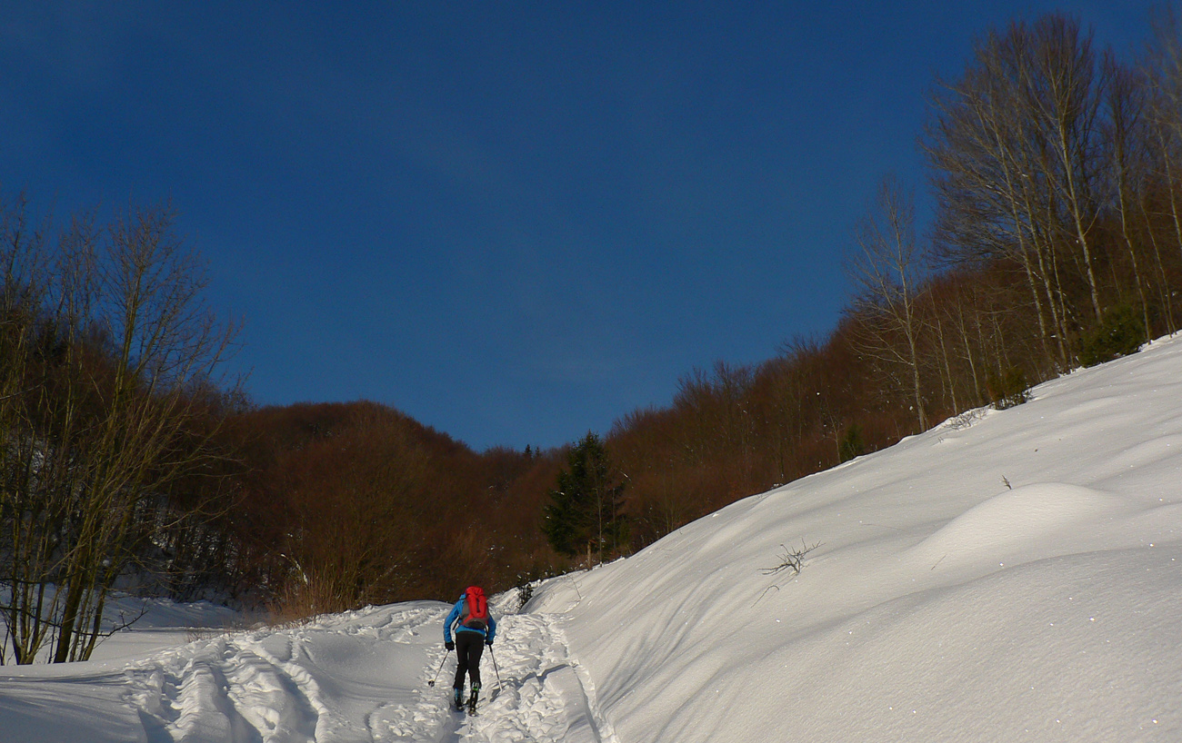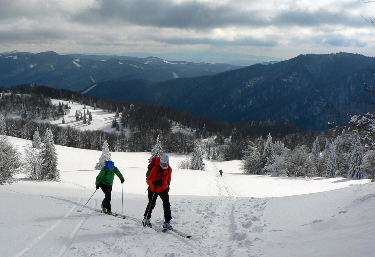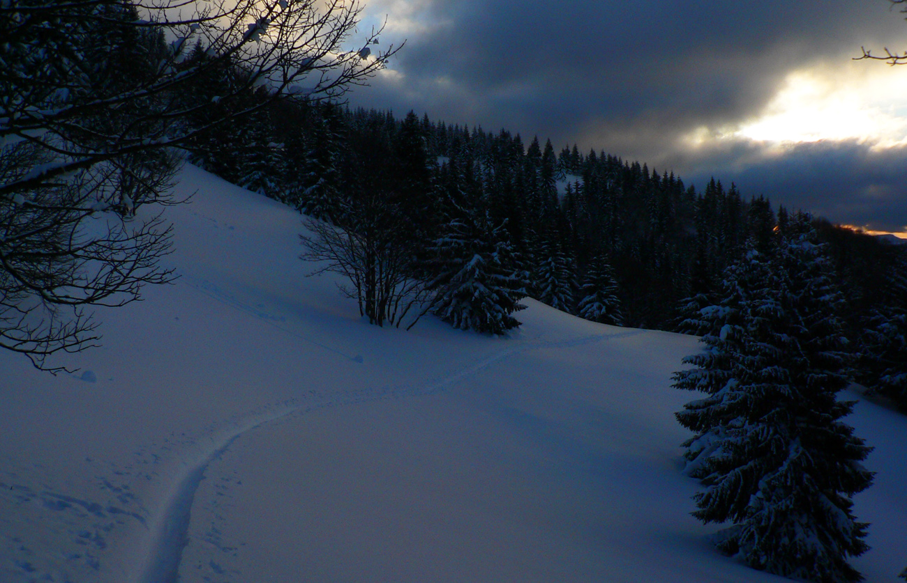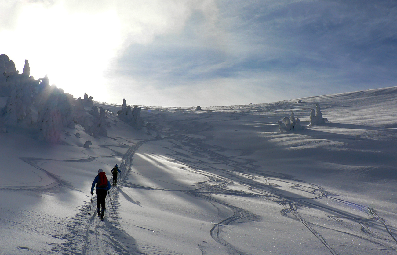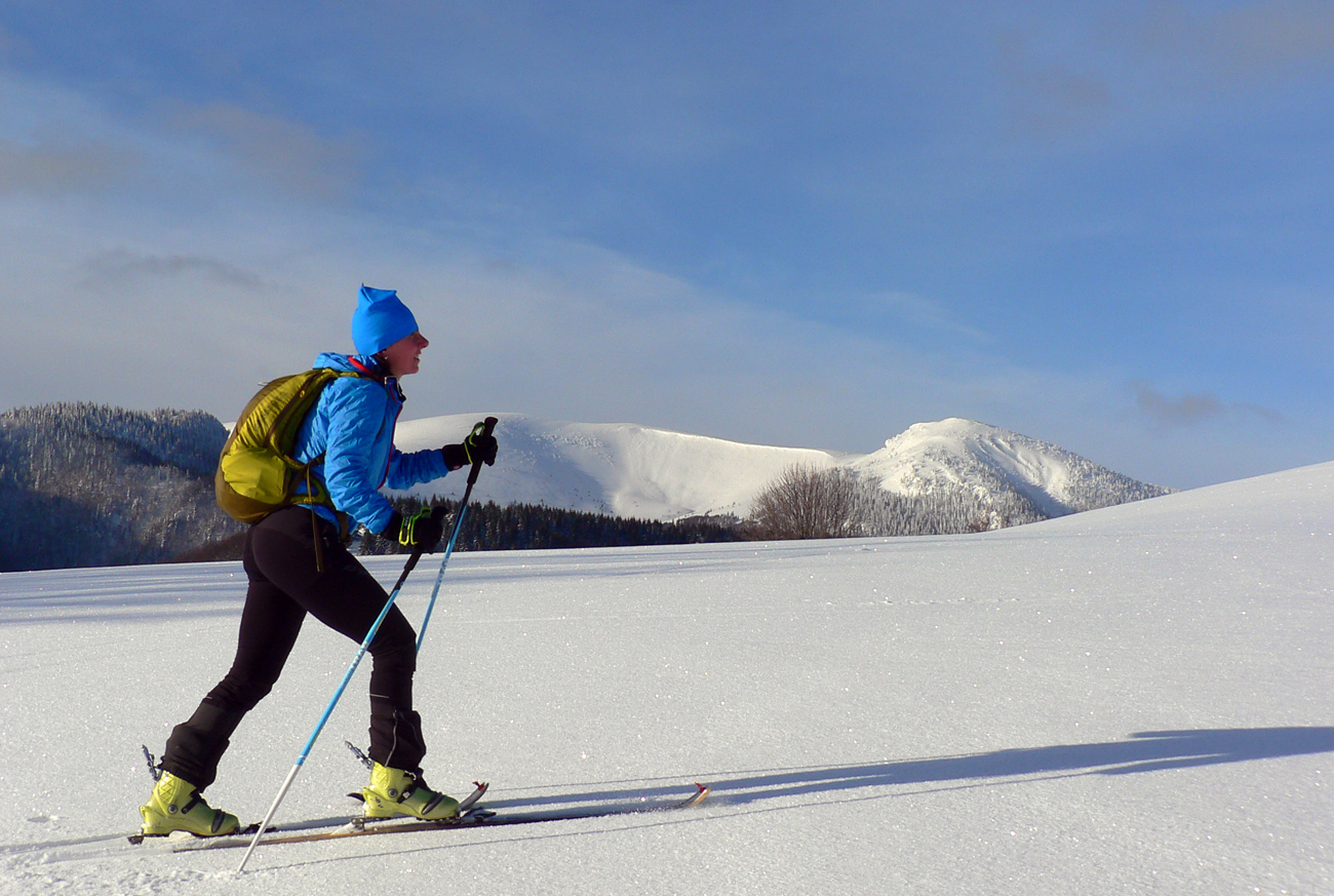 Začiatok na Donovaloch ešte za ranného šera a štípajúcej zimy, keď sa slnko ešte len dralo z mrakov nad Prašivou. Skialpová „trasa B“, príjemne stúpajúca lesom do sedielka pod Motyčskou hoľou. Krátka, ale parádna prachovačka dole do doliny a leštenie „domorodej“ skialpovej stopy až do Vyšných Revúc, na vyšný koniec.