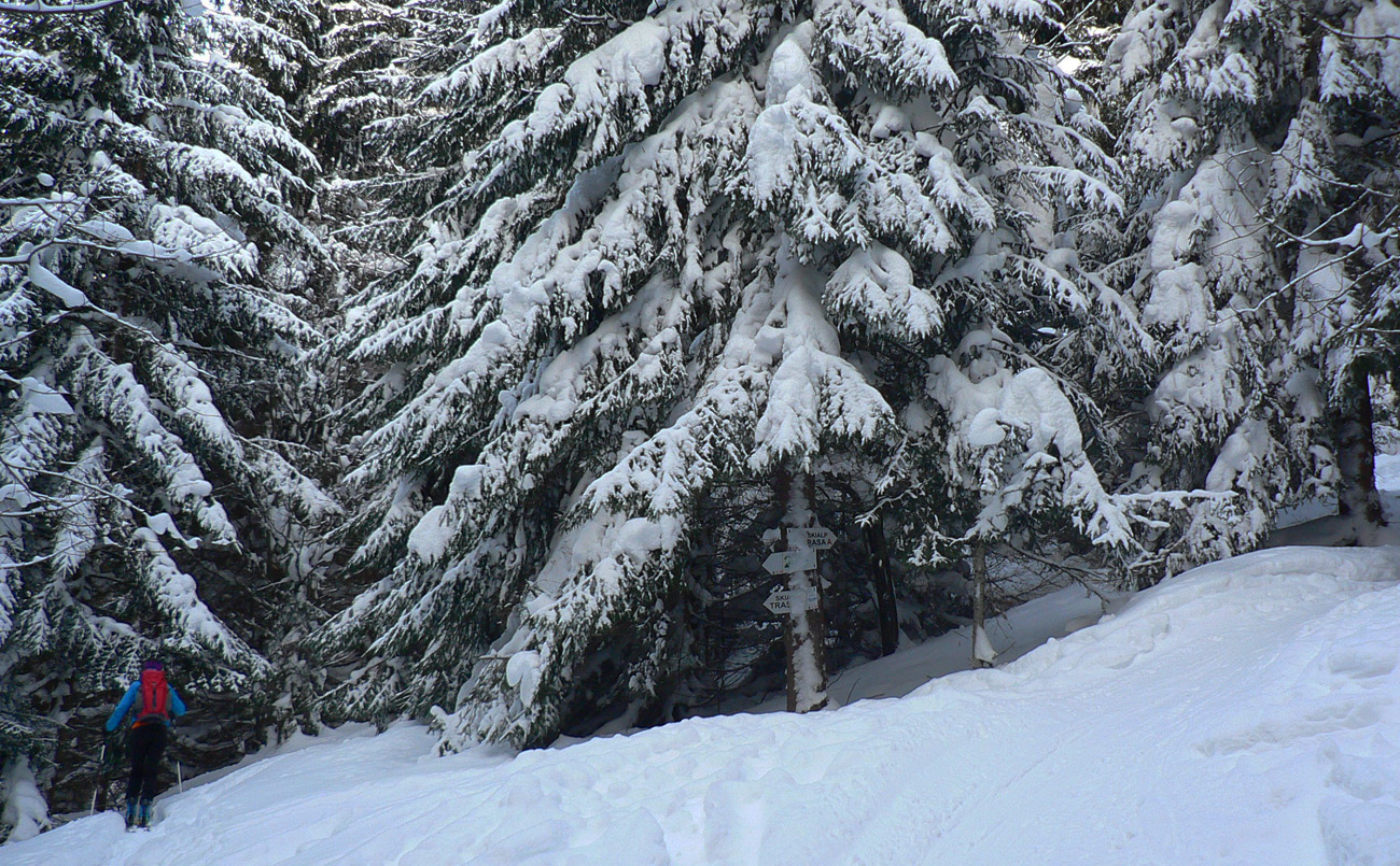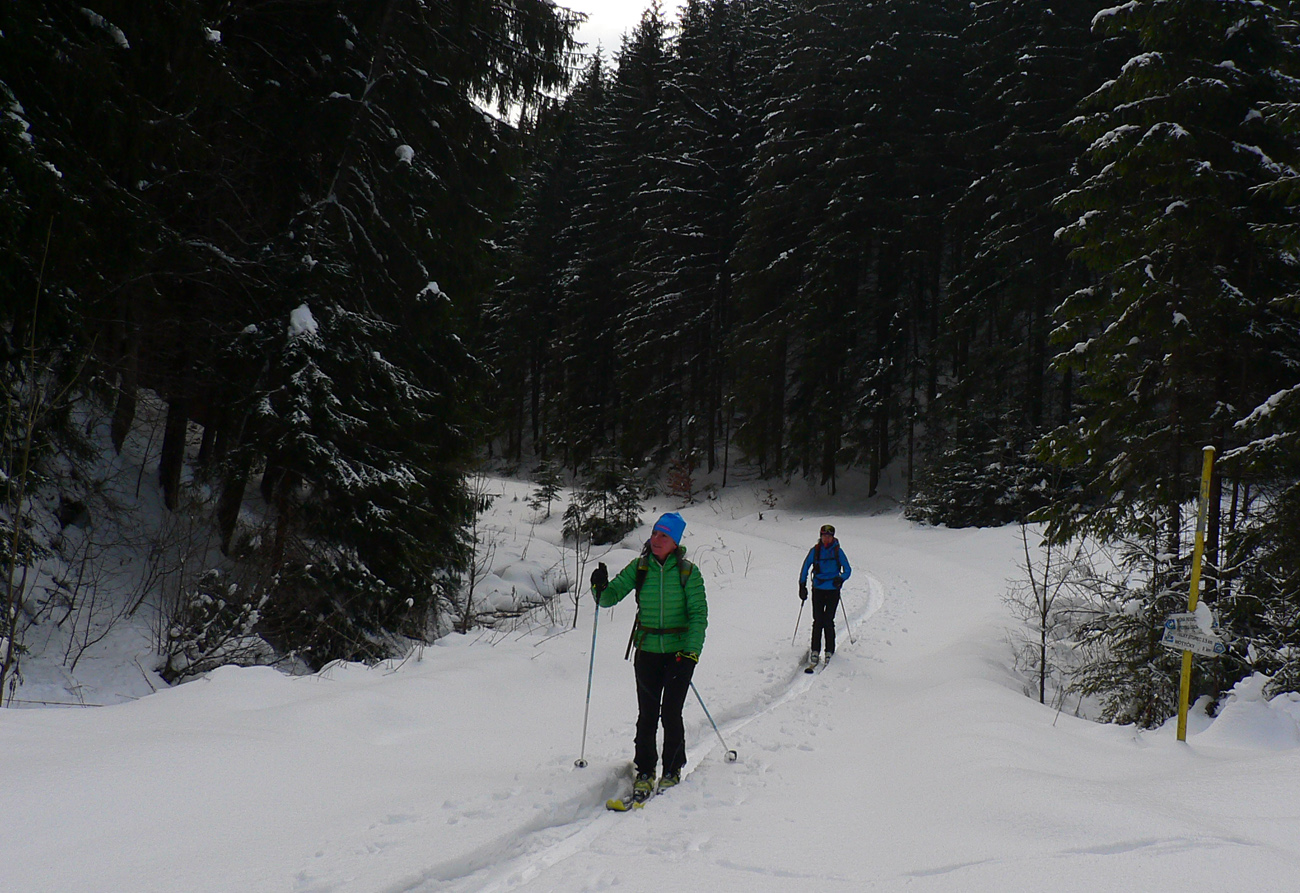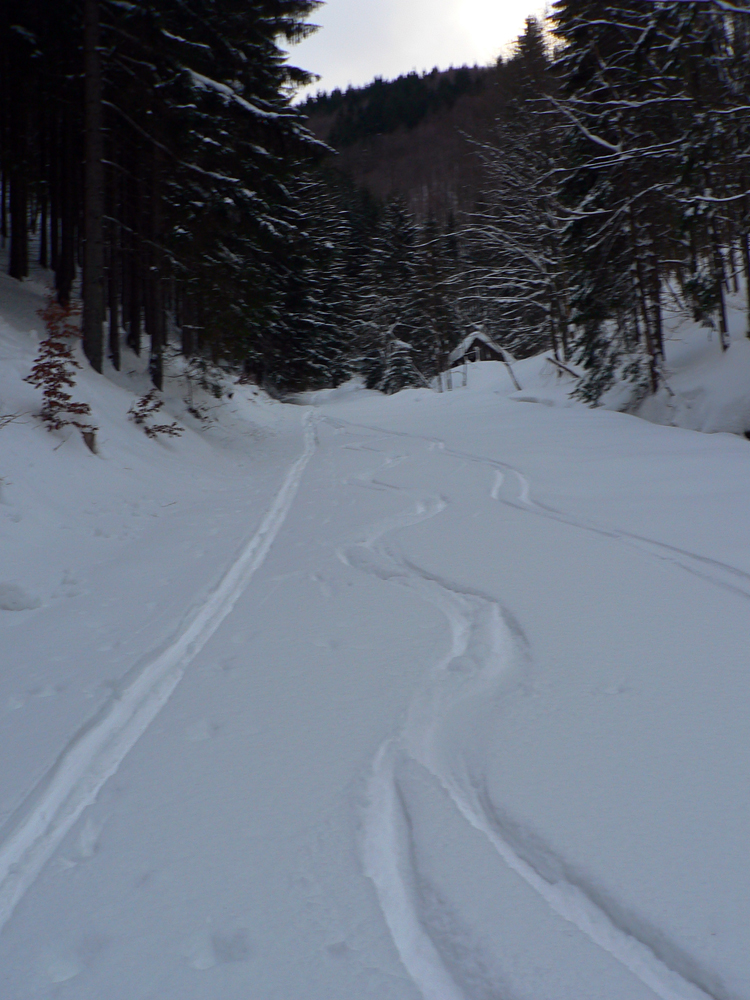 Čím nižšie, tým horšie a rozlyžovanejšie, tak únik pod vleky a do lesa. Prašan medzi stromami aj okolo Salašiek, zavadzala len čerstvo prerazená stopa pre krňačky. Posledné stovky metrov po rozlyžovanej zjazdovke, ešte jeden traverz lesom, vynorenie na asfaltke pri kríži pod Tureckou, trochu pešovania, kávička/kofolka v Krčme pod orechom a rozchod, každý svojou stranou.