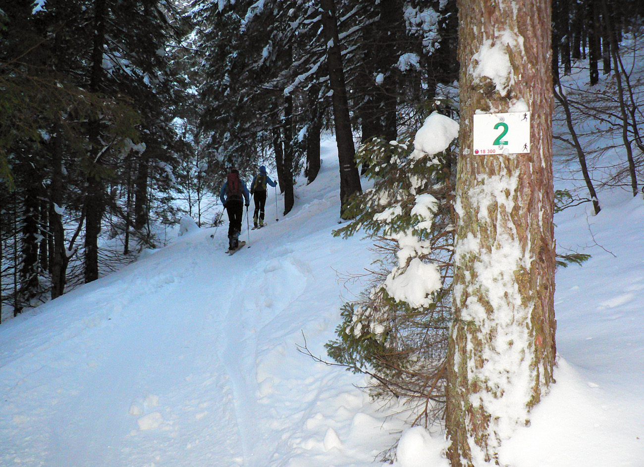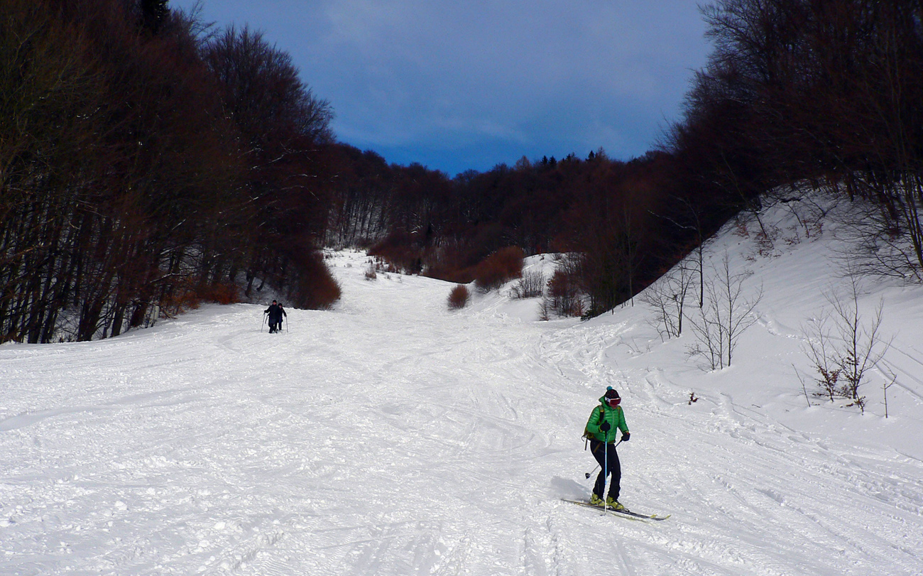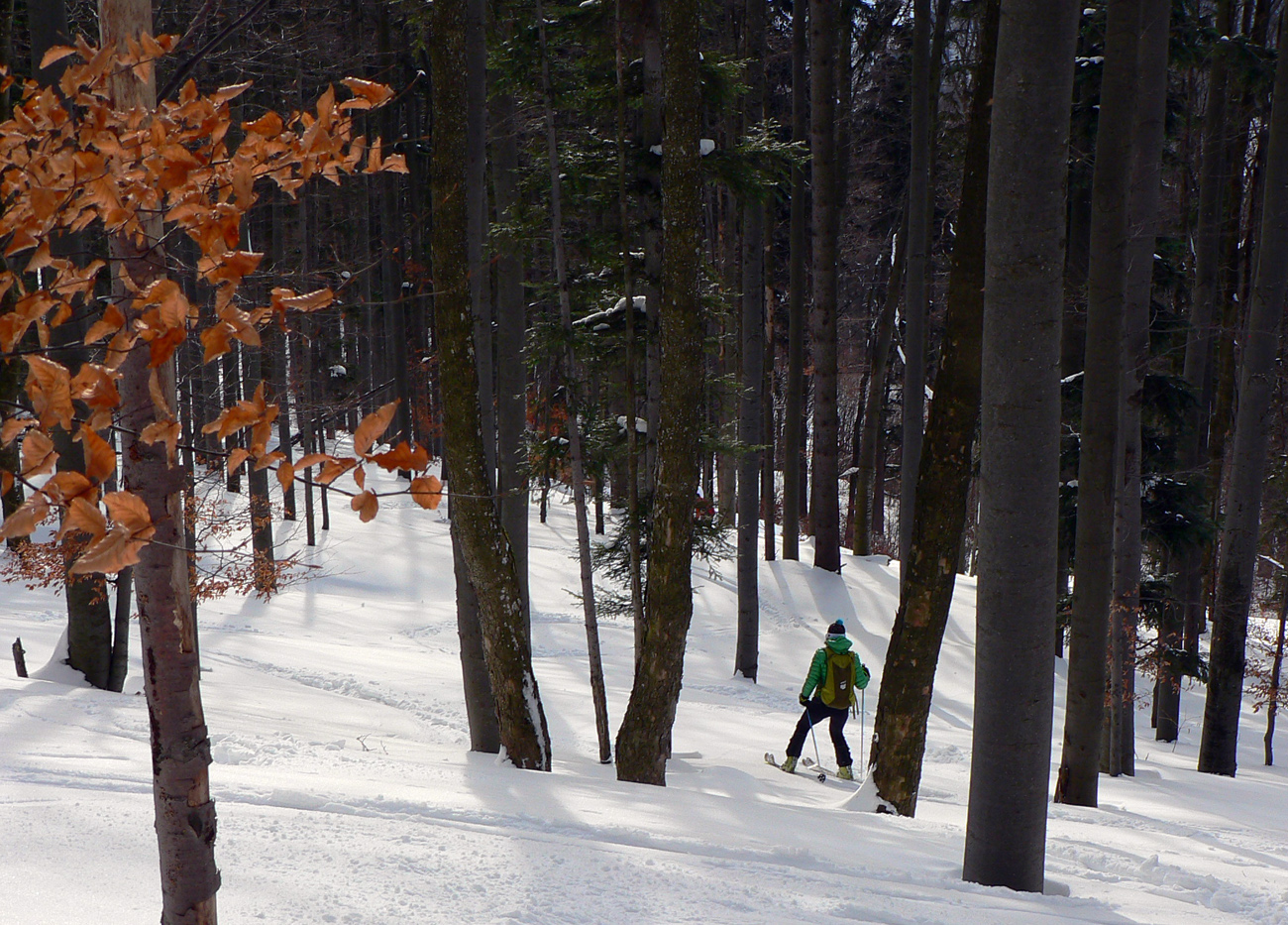 Čím nižšie, tým horšie a rozlyžovanejšie, tak únik pod vleky a do lesa. Prašan medzi stromami aj okolo Salašiek, zavadzala len čerstvo prerazená stopa pre krňačky. Posledné stovky metrov po rozlyžovanej zjazdovke, ešte jeden traverz lesom, vynorenie na asfaltke pri kríži pod Tureckou, trochu pešovania, kávička/kofolka v Krčme pod orechom a rozchod, každý svojou stranou.