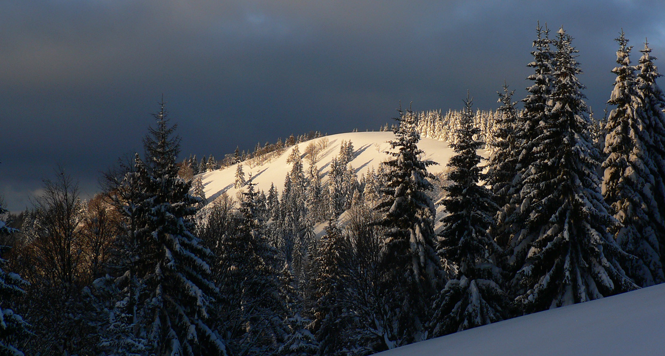 Aj Suchý vrch traverzom, len ešte nižšie položeným ako obvykle. Pomedzi muldu s čerstvými oblúčikmi (po dočasných nájomcoch salaša) a bludisko stromov, kompletne zabetónovaných do snehového panciera a závejov.