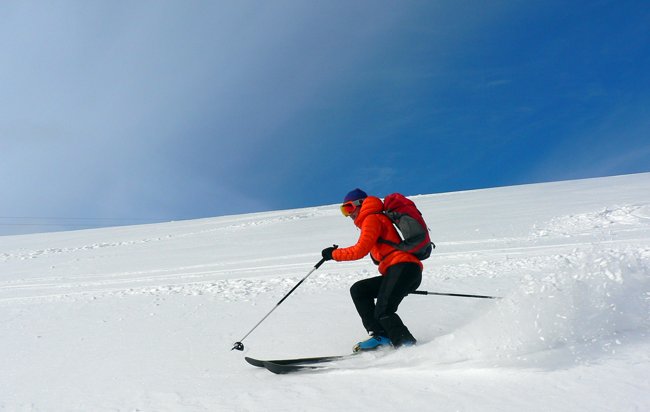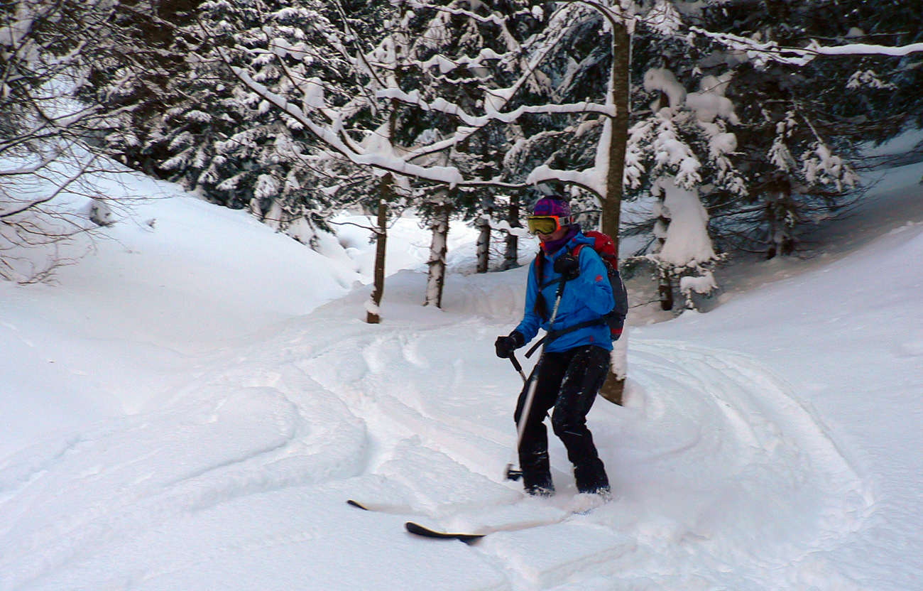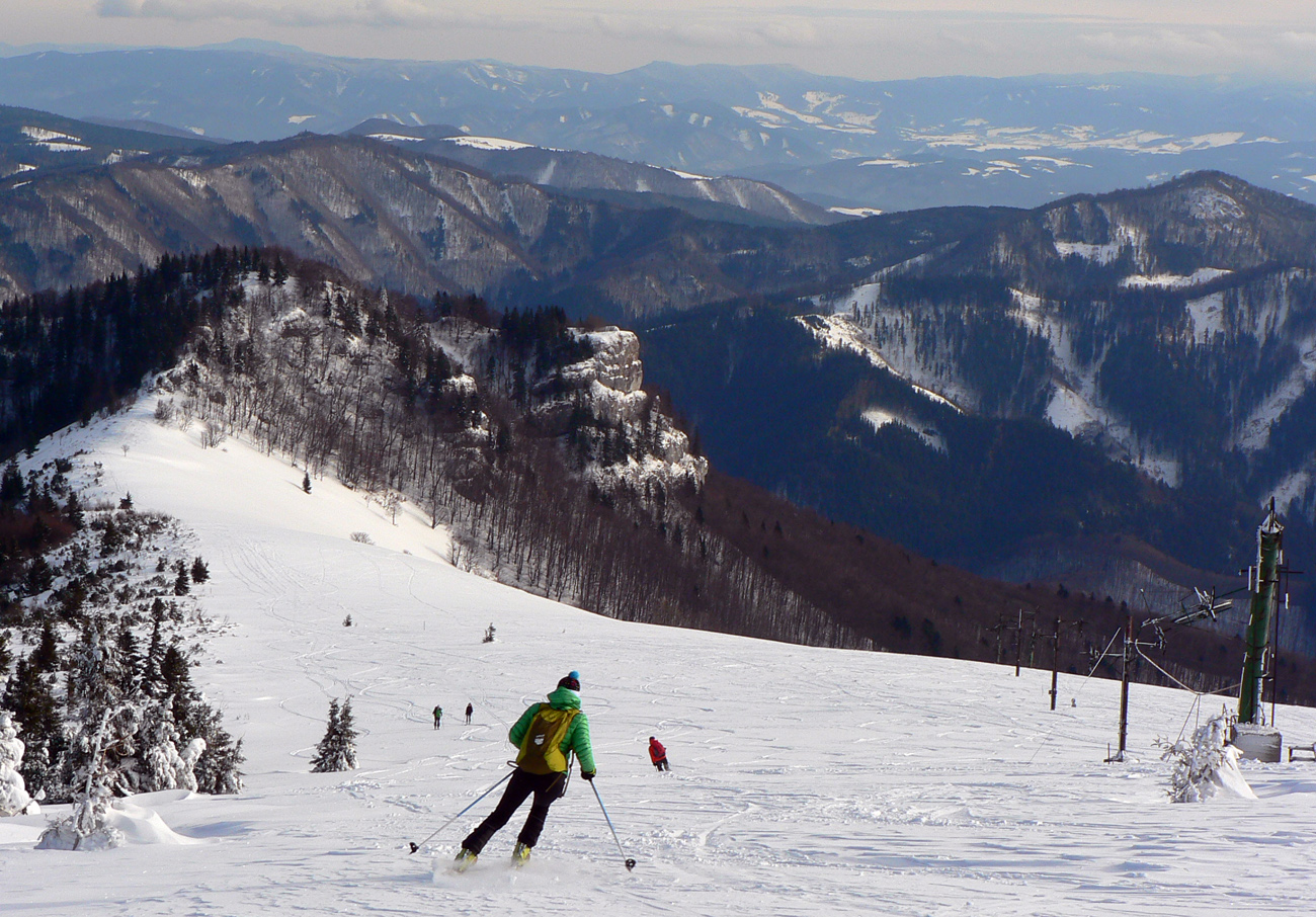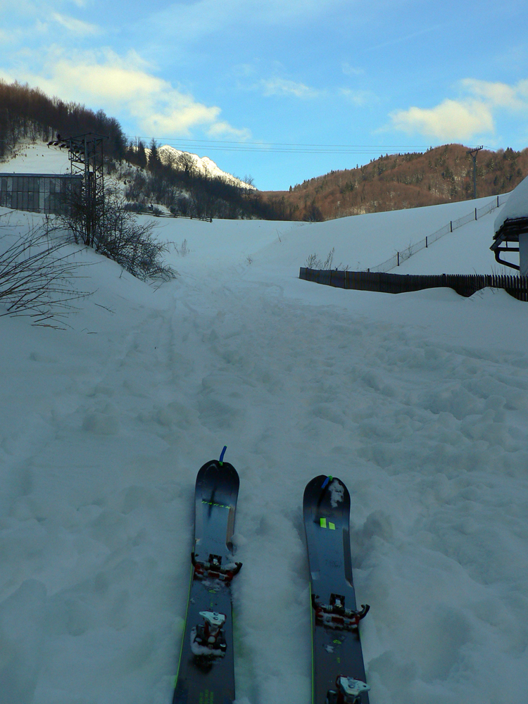 Posledné odlepenie pásov a posledný raz dole! Najdlhšia lyžovačka, z Krížnej. Hore samozrejme že tvrdo, pod Líškou už kráááásne oblúčiky v čerstvej vrstvičke páperia. Zákruta doprava, ešte lepšie oblúky na kôrke, ktorá držala.