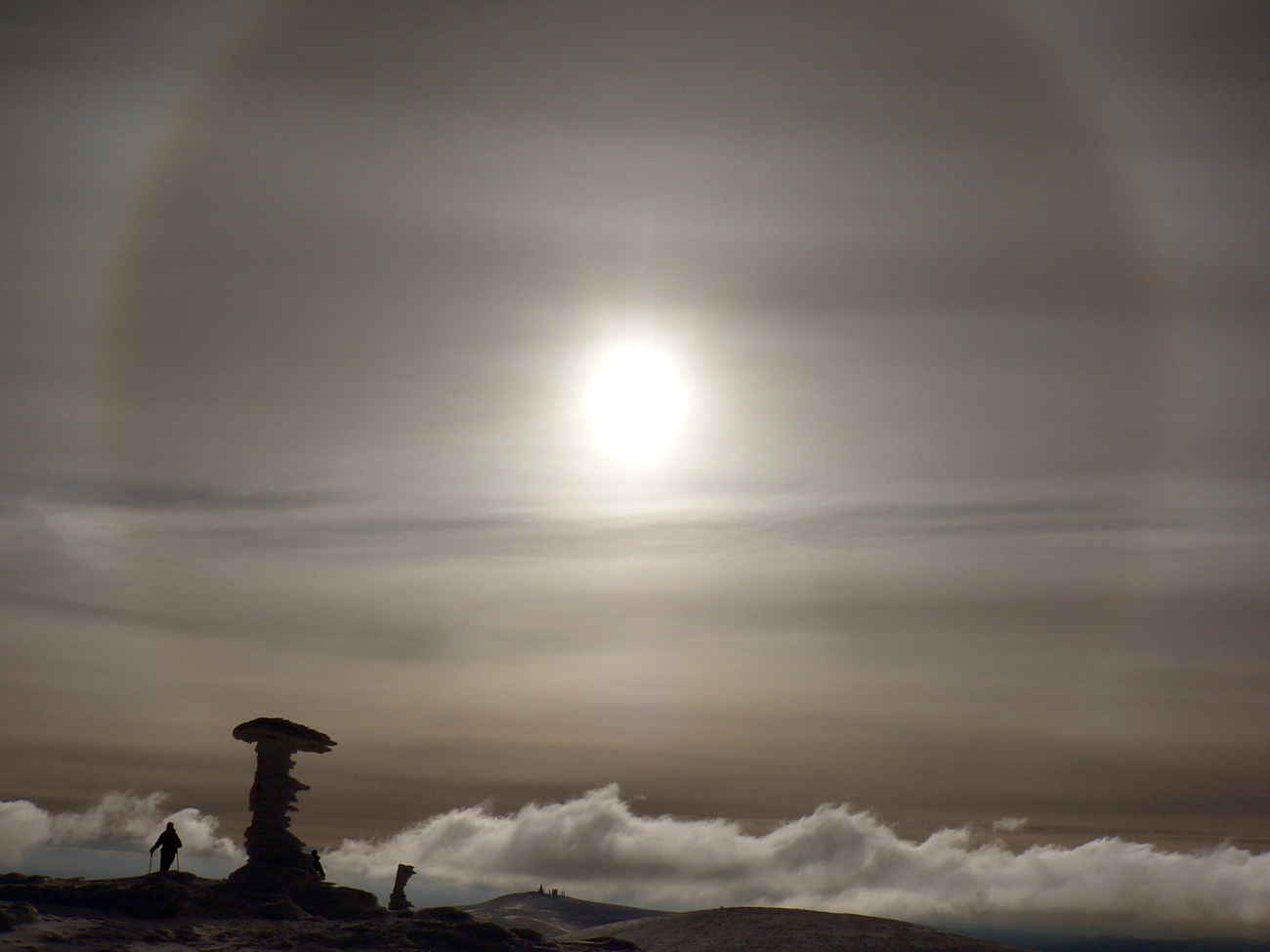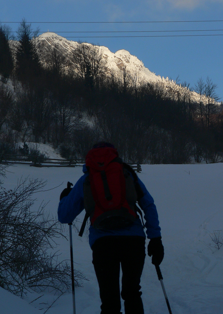 Drkotanie cez Ostredok a Frčkov až na Krížnu. Hľadanie mäkkého chodníčka medzi poliami snehových šindľov, vytvrdených nedávnymi vetrami. Priamo proti slnku, ktoré si nasadilo svätožiaru halo efektu.