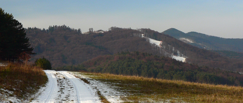 V malom sedielku sa sprava pripája žltá značka a vedie ma čoraz strmšie hore k lanovke. Tu už je cesta prejazdná hádam len tankom, taká je zerodovaná. Vlekári chodia autom hore „obchvatom“. Onedlho som hore a sú tu prvé výhľady, najmä dozadu na kotlinu: