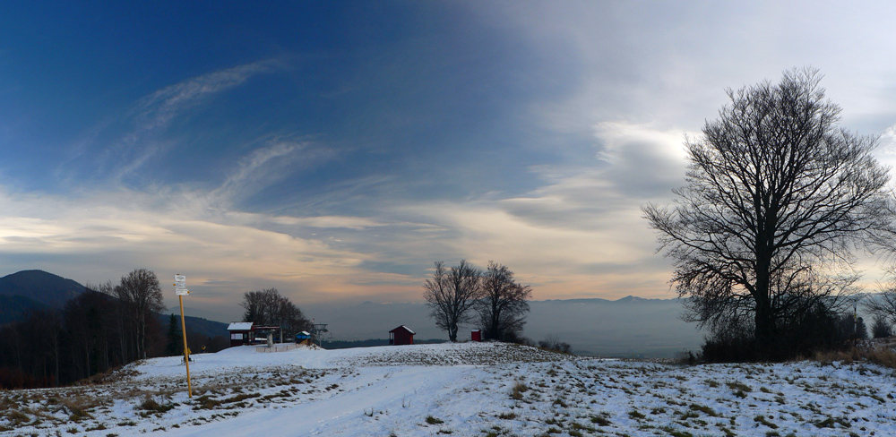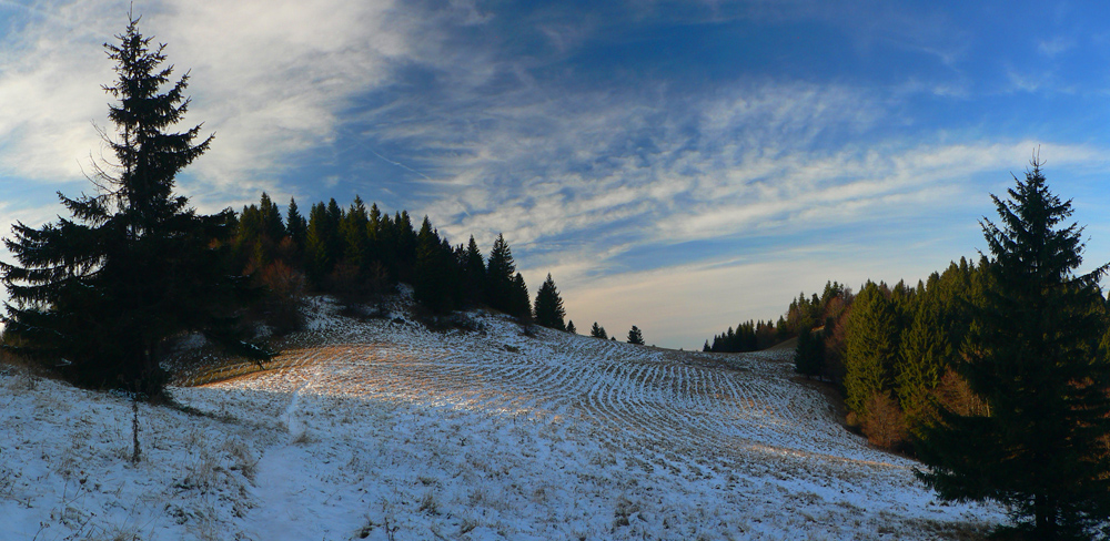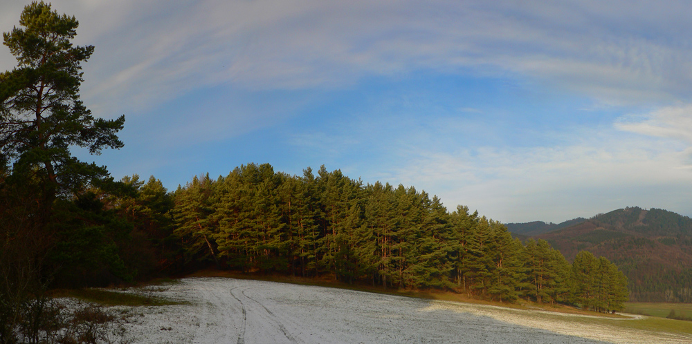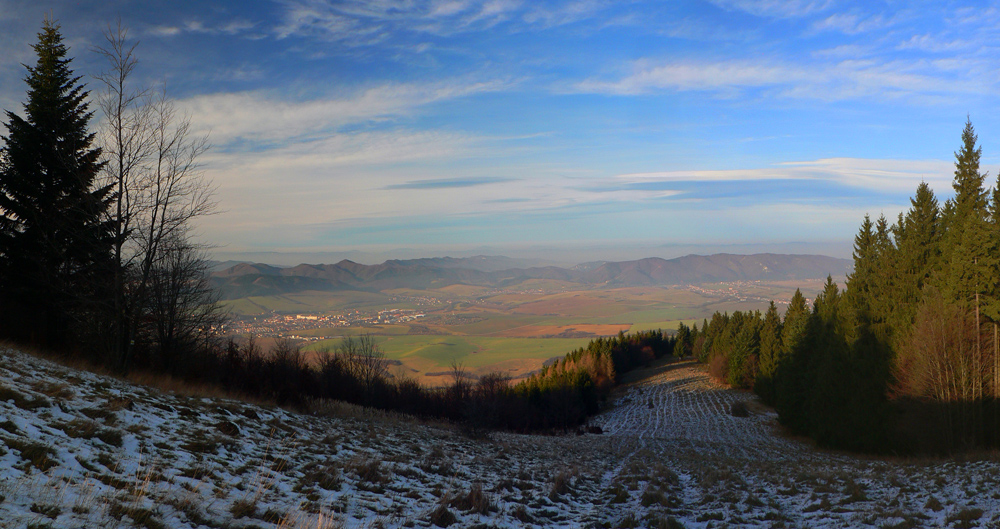 Idem po okraji lúk a borového lesa, po mäkkom a príjemnom čerstvom poprašku. Vpravo mám výhľad do Valčianskej doliny, vpredu orientačné body – Pivnica (831m) s hornou stanicou lanovky, vzadu trčí Javorina (1053m) a za ňou nesmelo Hnilická Kýčera (1218m):