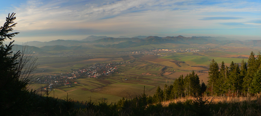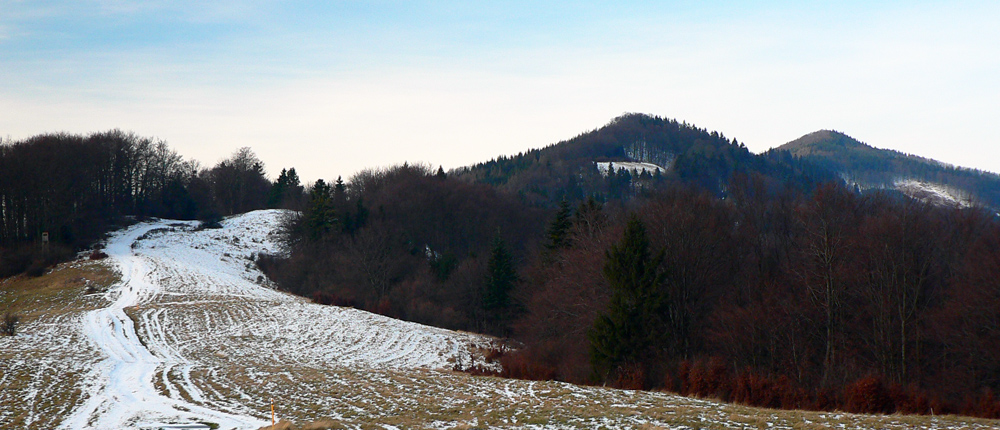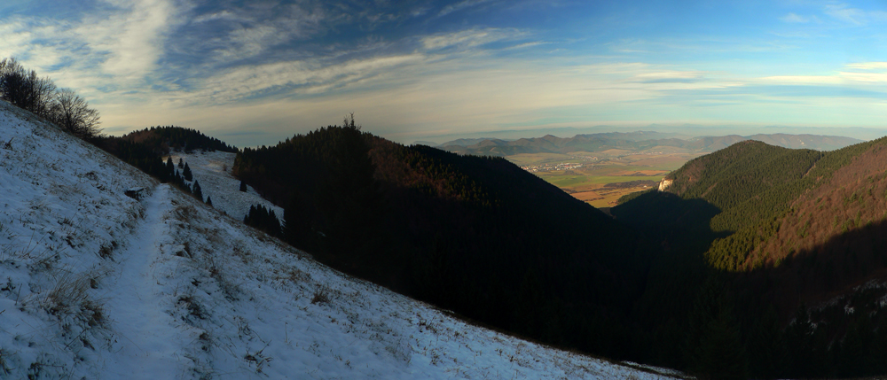 Terén sa dvíha, pohľad nazad do kotliny by bol stále lepší, len je tam dáko sivo. Vľavo sa otvára „okno“ do horného Turca, najbližšie vidno Kláštor pod Znievom:
