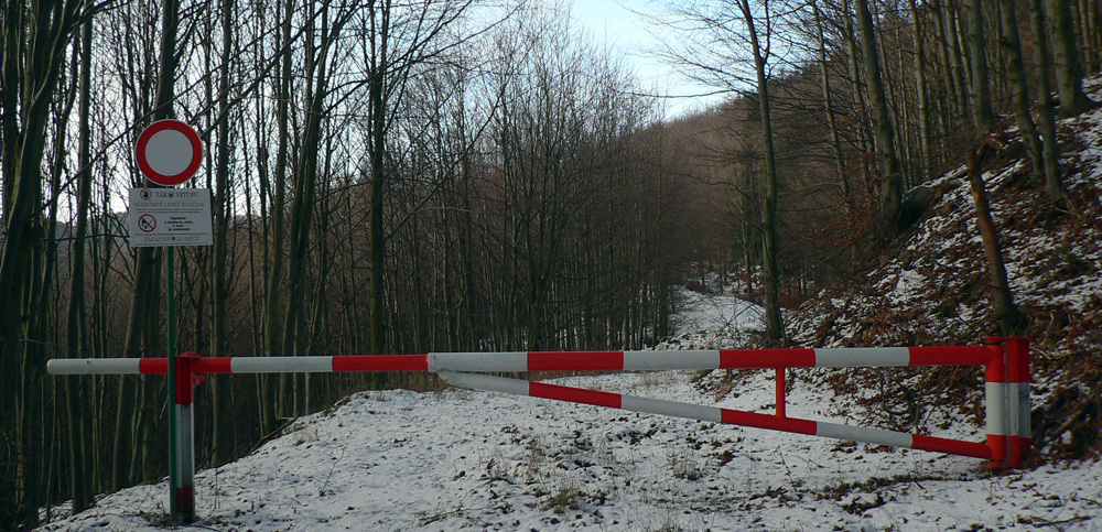 Po opätovnom ponorení do lesa to netrvá dlho a prichádzam k smerovníku „Pod Skalkou“, kde žltá pokračuje doprava a vracia sa dolu do Valčianskej doliny. Ja však potrebujem ísť doľava, cesta by ma cez lúky mala vyviesť na hrebienok pod Javorinu. Je na nej ale takýto protitankový zátaras: