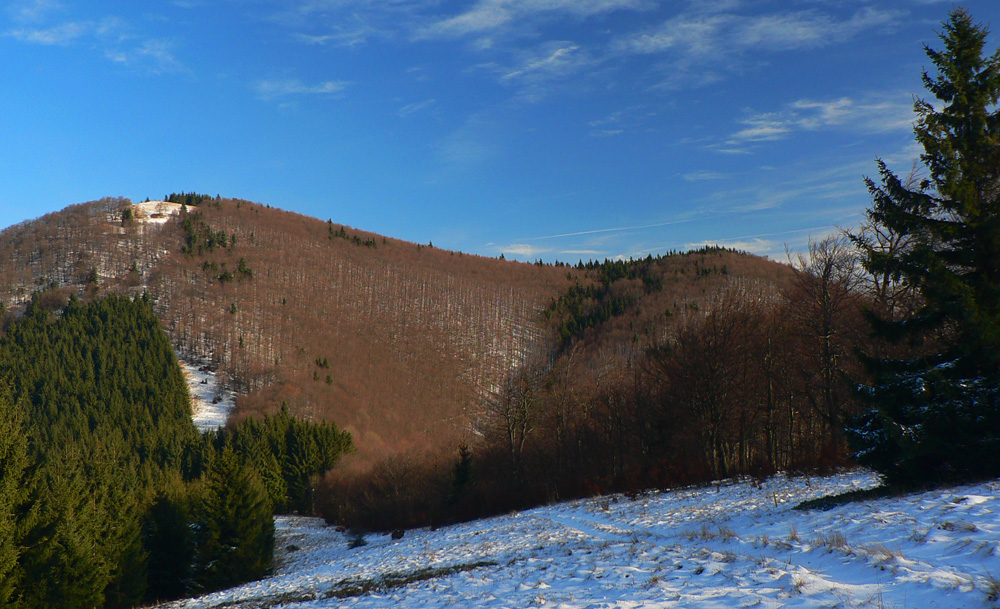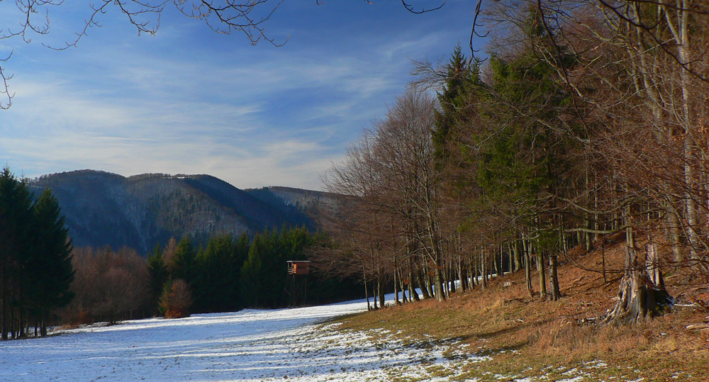 Za rampou na ceste kopy hliny, smerom na druhú stranu cesta zatarasená podobne, vyššie dokonca prekopaná bagrom naprieč... Čoho sa tu tak boja „vlastníci lesa“, že si dovolili dať sem dokonca zákaz vstupu, nielen vjazdu? Takže tam just vleziem, nech ich aj šľak trafí :-) Zo dve serpentíny po tej „zakázanej“ zvážnici a je tu krásna lúka, ale s hnusným posedom. To sa to vraždí, keď máte okná zateplené a hneď naproti kŕmidlo, že? Pri pohľade cez dolinu na južnom horizonte presvitajú cez stromy hole na Jankovej: