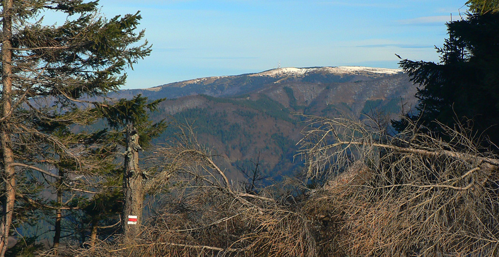 Hore trochu fučí, ale vôbec nie podľa oranžovej výstrahy SHMU. Nebo sa vyčistilo, rozhľad parádny. Na juhu v diaľke dominuje nezameniteľný Kľak, pod ním, bližšie ku mne, belie sa priesek na Úplaz a vpravo od neho hrebienok, ktorým vedie žltá značka do Ďurčinej: