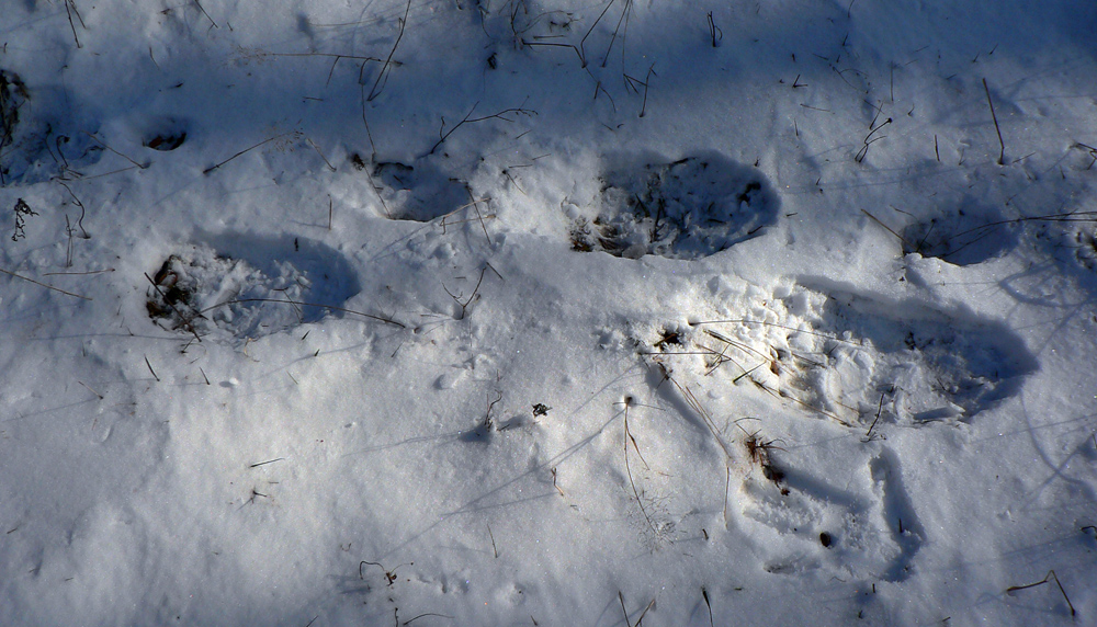 Na lúke sa k mojim stopám pridávajú na chvíľu aj iné a myslím si, že dosť veľké. Ich majiteľa aj cítim, len škoda, že ho nepočujem alebo nevidím. Ale bol tu asi už včera, stopy sú už trocha namrznuté: