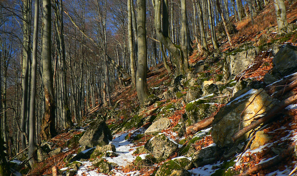 Chodník ide v strmom traverze. Svah je otočený na juh, takže je sucho, príjemne teplo. Južnému obzoru dominuje Kľak, o kus ďalej sa pridáva aj Strážov. Miestami sa borím po kolená do lístia, miestami skáčem po skalkách, je to pestré: