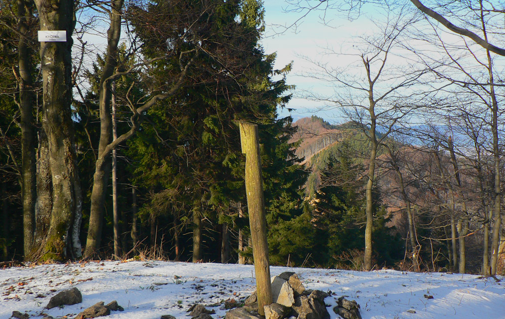 Na Úplaze totiž chcem zistiť, koľko času mám k busu, čo mi ide z Rajca. Tým smerom som ešte nešiel. Odbočujem z hrebeňa doprava (na západ), len fotka je z opačnej strany :-) Aby bolo vidieť aj Kýčeru vzadu za smerovníkom. Jednoducho prechádzam z červenej na žltú:
