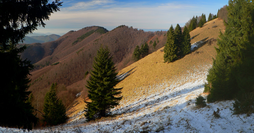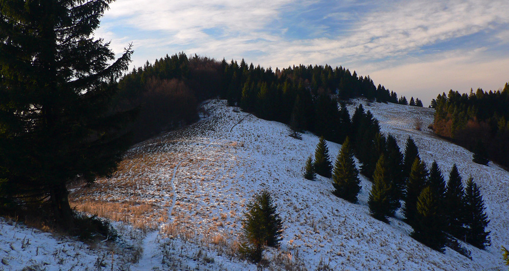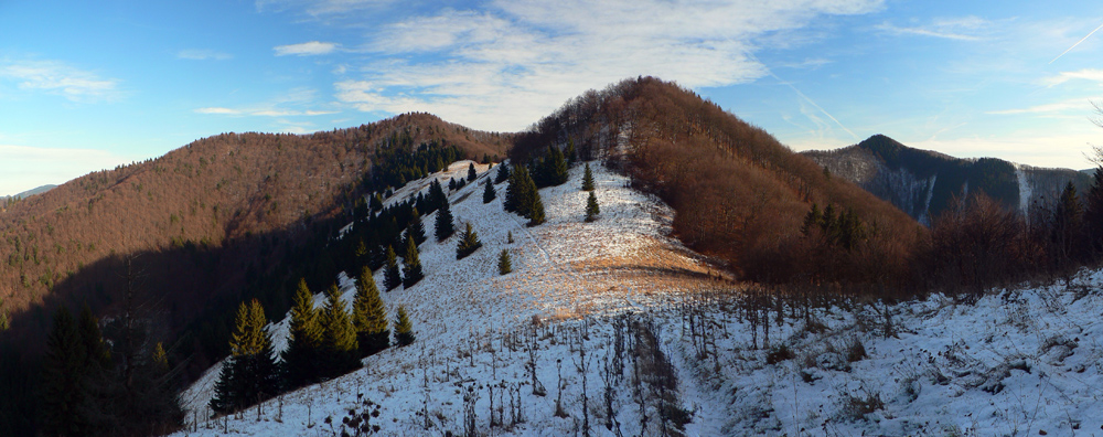Presnejšie z Valče cez Hnilickú Kýčeru a Úplaz do Ďurčinej. Prečo tade? Nooo, lebo prístupy na hrebeň Lúčanskej Malej Fatry sú zväčša dolinami, a tie vieme ako vyzerajú v dnešnej „dobe drevorubačskej“ aj v chránených územiach, že? Tu ale pôjdem z dediny na Hnilickú Kýčeru po hrebienku medzi Valčianskou a Slovianskou dolinou. Väčšinou mimo značky, tu sa to smie. Len kúsok ma bude sprevádzať žltá. Z Kýčery prebehnem na Úplaz po hrebeňovej červenej a odtiaľ už poslušne po ďalšej žltej do Ďurčinej (a z nej už len po asfaltke do Rajca). Zas po bočnom hrebienku, ktorý oddeľuje Porubskú a Lesniansku dolinu. A čo je najlepšie, na trase je veľa úsekov po lúkach, holiach, no proste výhľady budúú! :-) Ak niekde nazakufrujem, mal by som to v pohode stihnúť za svetla aj takto v polovici decembra. Za nejakých sedem hodín najviac: