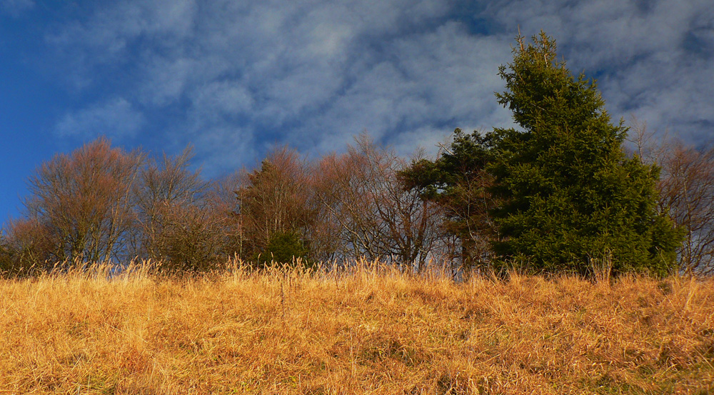 Prechádzam cez lúku sklonenú na juh a obohnanú „živým plotom“ z mladých bukov, vyzerá to ako umelo nasadené. Medzery v plote sú zároveň miesta, kade ide chodník: