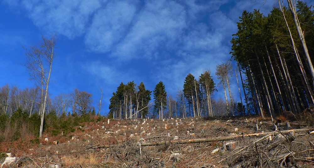 Potom sa to trochu pokazí, lebo treba prejsť cez dva či tri ťažbou rozbité úseky. Čerstvo rozbité, ešte tu ležia spílené stromy a je tu natiahnutá lanovka:
