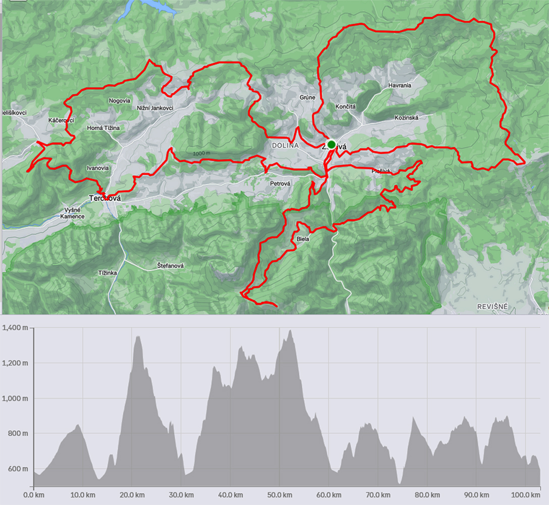 S takýmto menom sa narodila nová stovka na našej scéne. Lebo Jogošíci si na seba uplietli bič a ku svojim tradičným detským tratiam (43 a 71 km) pridali aj dospelý variant. Na druhej strane to mali jednoduché, lebo ku dvom okruhom (cez Pupov a cez Minčol) len pridali tretí, cez Osnicu. Tak sa zrodil na naše pomery nevídaný ultrakoncept, kedy sa nebeží okruh alebo čiara „z bodu A do bodu B“, ale taký „trojlístok“ s epicentrom v centre Zázrivej. Až tretí zbeh ku amfiteátru bol cieľový. Veci neznalých ultrášov na toto šialenstvo lákal prívlastok „najľahšia stovka na Slovensku“ s parametrami 101 km / 3800 v. m. a orgom uverilo 130 bláznov, čo bol zároveň aj limit (odštartovalo vraj 101). Inak na všetky trate prišlo cez 400 ľudí, takže celkom masofka. Takže tu nižšie je mapka, ako to vyzeralo, aj keď nepresne, lebo som si fajne zabehol hneď v závere prvého kolečka, keď som v bordeli pod nohami prehliadol odbočku. Kým ale kiláky zhruba sedeli, prevýšenie ani náhodou. Aj sme sa viacerí divili, kde by v tých strminách okolo dediny Jogošíci našli toľko roviny. Takže plus dobrých 700 m oproti propozíciám: