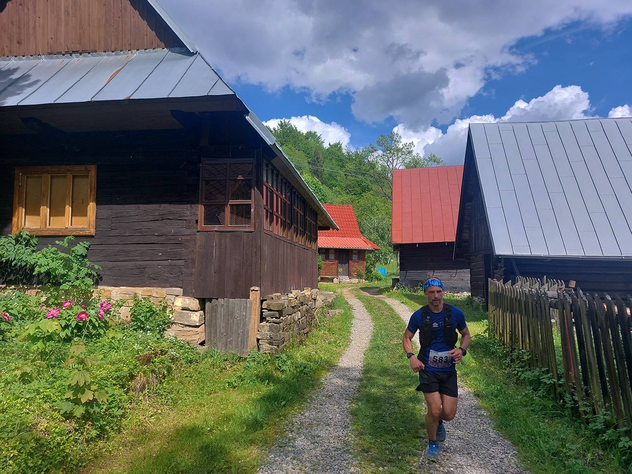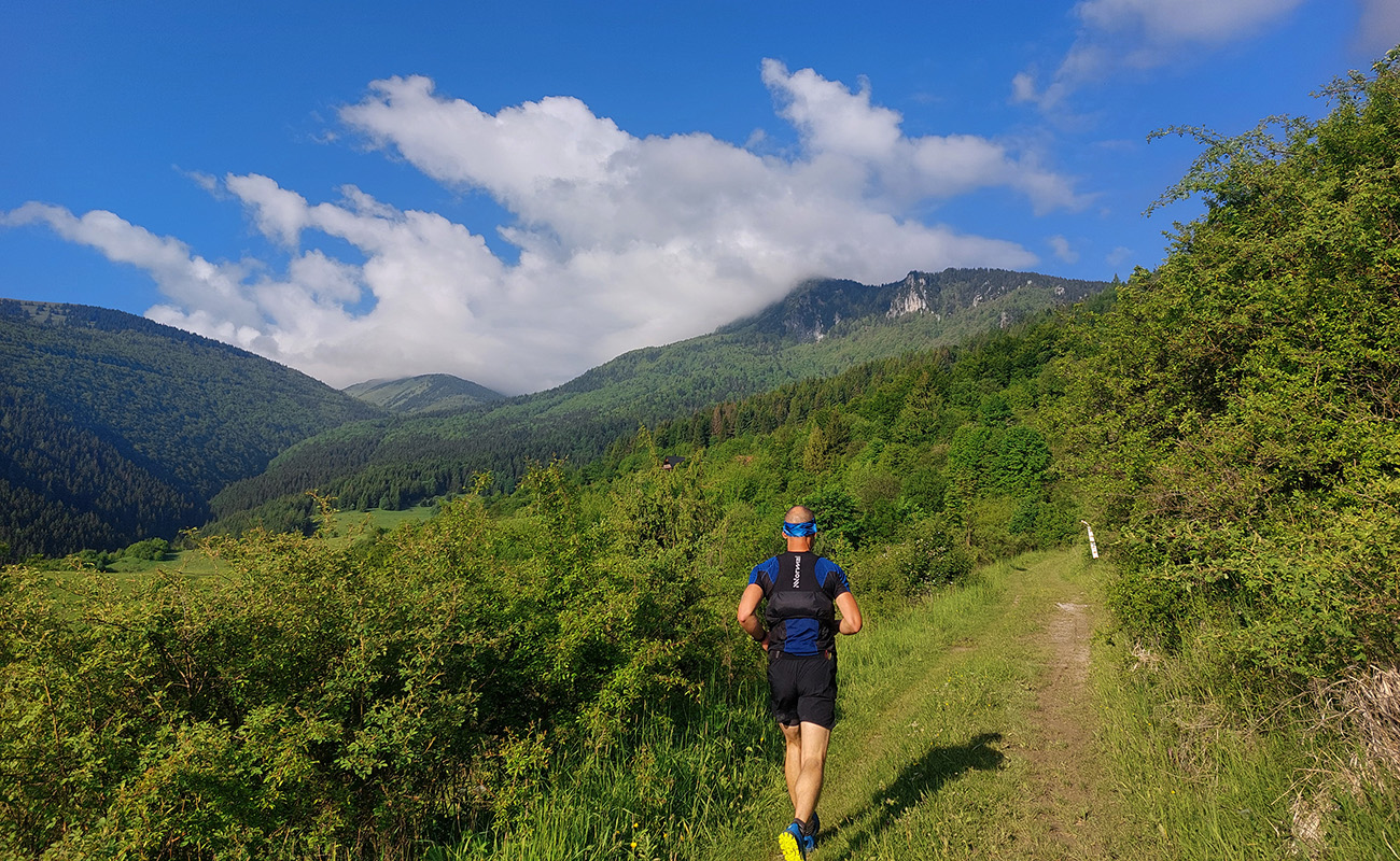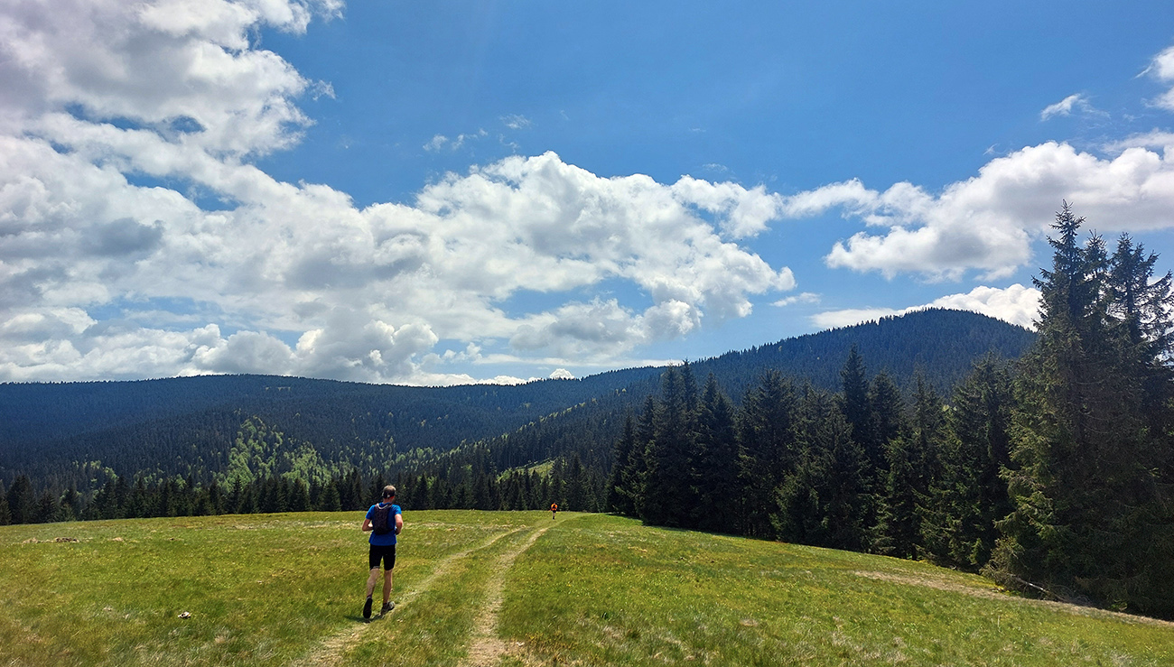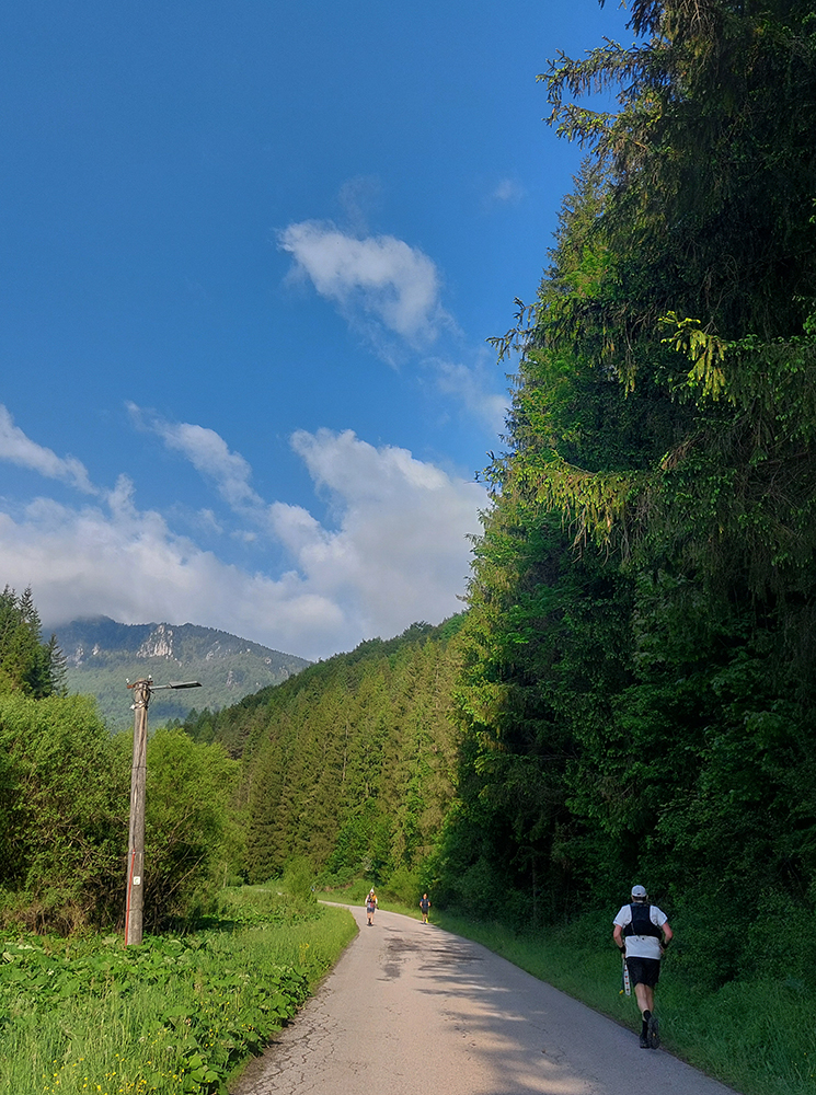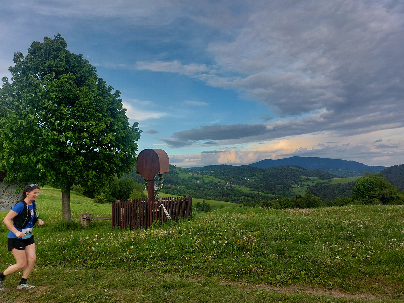 To už sme teda boli na začiatku posledného okruhu, „terchovského“ (40 km). Bol najbehavejší, v prvej polovici v traverze popod ten Pupov (1096 m - najvyššie slovenské bradlo), cez malebné osady a s parádnymi výhľadmi cez dolinu na hrebeň Krivánskej Fatry. Dobré bolo, že sa poriadne zaťahovalo, v diaľkach miestami aj pršalo a hrmelo, nad nami ale nič. Zbeh do rozhicovanej a hučiacej Terchovej, priamo do city, po lúkach, bol pod mrakom príjemnejší.