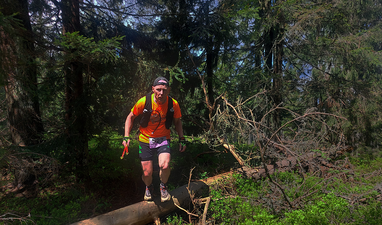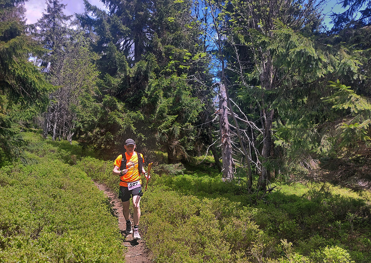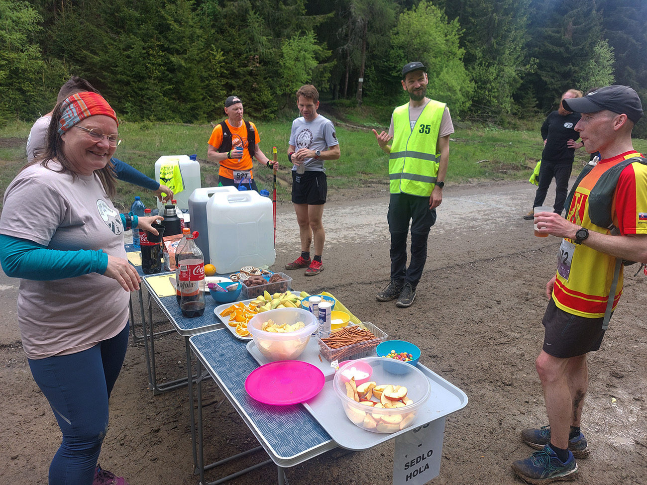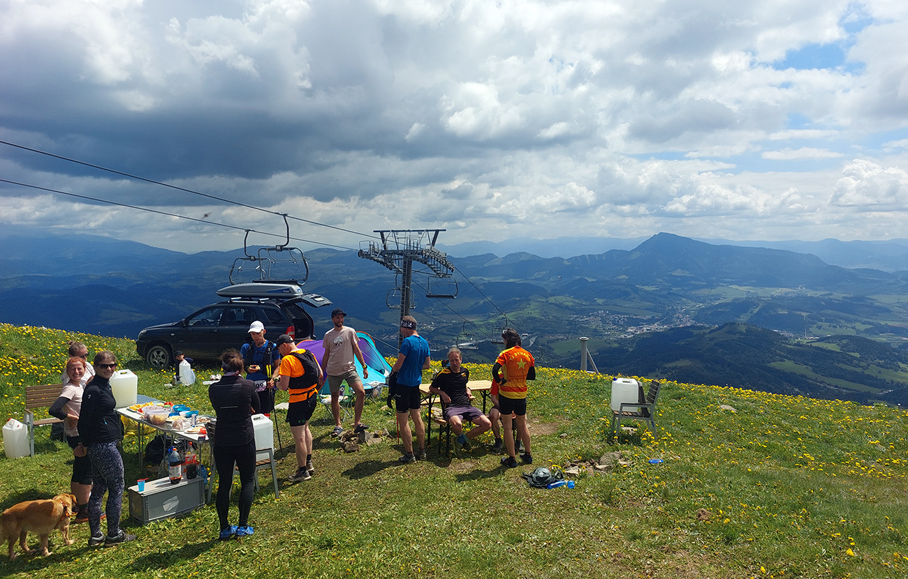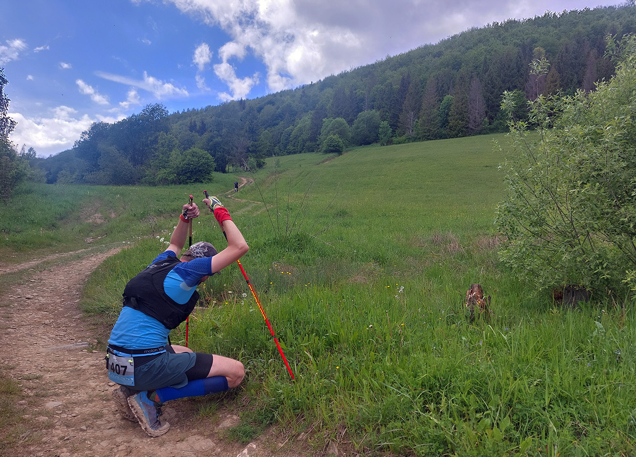 V cieli nás nakŕmili a už nás hnali do druhého okruhu, „oravsko-magurského“ (30 km). Najprv poriadne strmo hore na Javorinku, s plným bruchom sa niektorým aj ťažko stúpalo. Nižšie cez lúky, oplatilo sa obzerať dozadu. Potom stále strmšie lesom. Modro značená hrebeňovka na Minčol by aj bola teoreticky rýchlo behateľná, to by ale práve tam nesmelo byť buď bahno, alebo preliezky, alebo všetko naraz. Bol to miestami boj! Ale bola aj pekná čučoriedková divočinka na Paráči a lúky okolo Vasiľovskej hole. A asi v tretine hrebeňovky čakal ďalší krmelec.