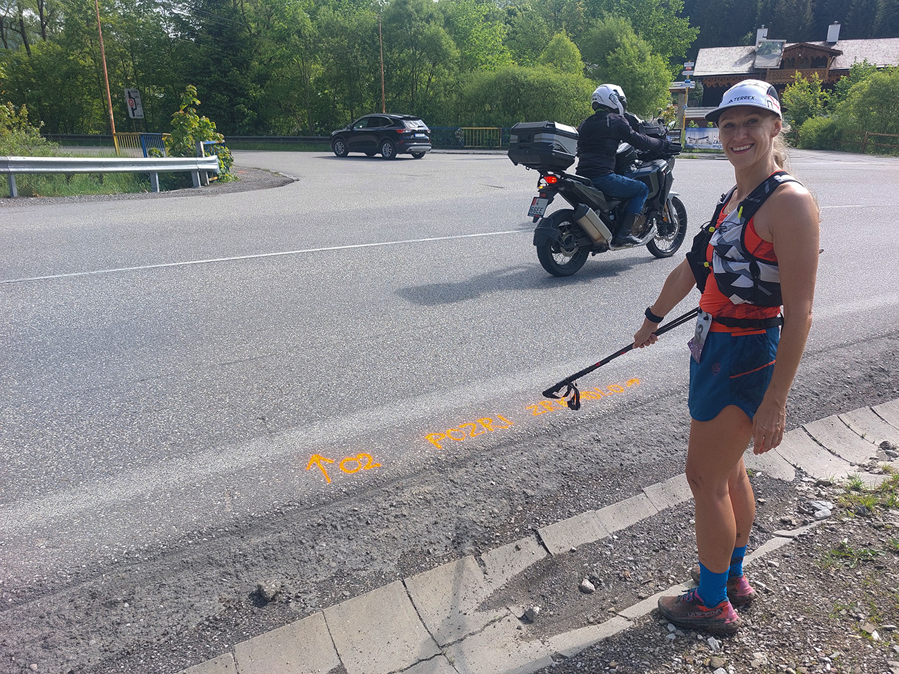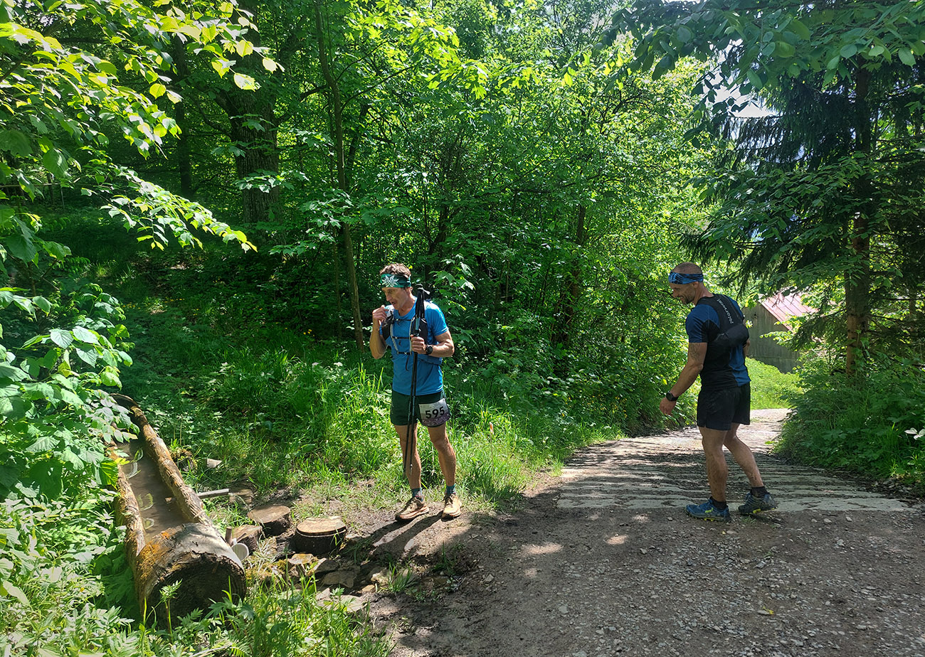 Dole nás orgovia hnusne ojekabátili, poslali nás hneď dole dedinou, bez prebehu cez cieľový priestor, asi aby sme neodjedali finišerom z kratších tratí. Ale kto chcel, mohol si odbehnúť sa nadžgať, zas tých vari 200 m je nič. Lebo ku krmelcu priamo doma u Jogošíkovcov to boli ešte nejaké štyri kiláky a jeden kopec. A ohrievač bežal na plný výkon, hlavne na asfalte dole dedinou (v protismere záveru prvého kola) to bola chuťovečka. Našťastie aspoň začiatok stúpania potom vedie hlbokými lesnými tieňmi. A aby sme si zaslúžili, záver ku kolibe strmóóó dole – s vedomím, že takisto strmóóó sa budeme musieť štverať nazad hore, pod Pupov.