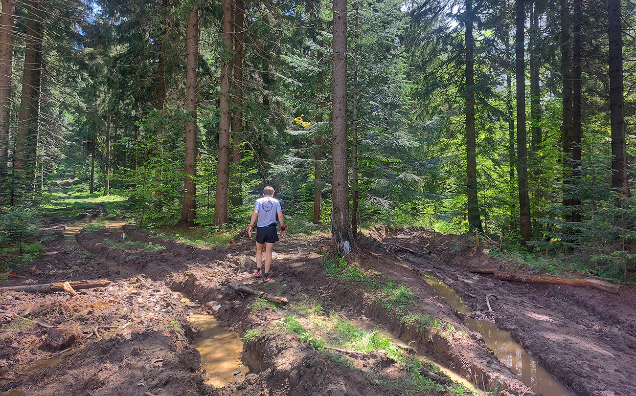 Zišla sa konkurencia nevídaná, skoro všetci slovenskí mimozemšťania sa dostavili, čakali sa poriadne hukoty. Malo to byť aj fajne behavé, tak sme viacerí tipovali víťaza okolo deväť hodín. Nakoniec Patrik Milata za rovných 10 – a nie len to prevýšenie navyše bolo na vine. Kto pozná miestnu „geológiu“, vie, že blato je tam na cestách aj mesiac po daždi. Navyše vylepšované traktormi a autami. Teraz bol deň po daždi a ťaží a jazdí sa tam všade intenzívne. Do toho na mrte prekážok ako na Spartanovi, no radosť nohy si lámať. Zato ale výhľady bombastičné a krajina samôt a osád, lesov a lúk neskutočne strakato krásna a pestrá – len škoda, že sa bolo treba najmä pod nohy pozerať. Podrobnejší prehľad poskytne fotogaléria, tu teda len základná charakteristika tých troch okruhov. GPX je na stiahnutie hore a fotky na Zonerame sú TU .