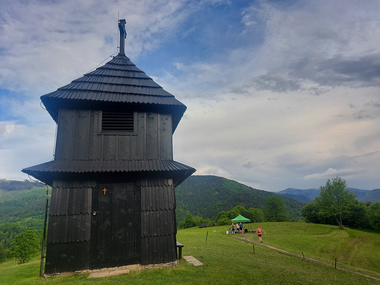 Nejakých 20 kilákov do cieľa, v podstate cieľová rovinka, len s malou, pre zdevastované nohy zákernou vsuvkou – strmou odbočkou dole a zas hore popri zvoničke u Marunov. Tam bola posledná kontrola a aj niečo tekutô do gágora mali. Pevnô do bruška (ako je na stránke akcie písanô) už nie. Inak by to ostatnô bolo teoreticky krásne behateľnô, ale veď vieme... Niekde bol aj problém, kade sa tým trasoviskám vyhnúť. Spod Kýčerky ale už len pekný traverz lesom, zbeh Tesnou dolinou po cyklotrase a na záver dva malé hupáčiky cez grúniky medzi dolinami, popod Pupovec a Pálenicu. A cieeeeeeeľ!!!
