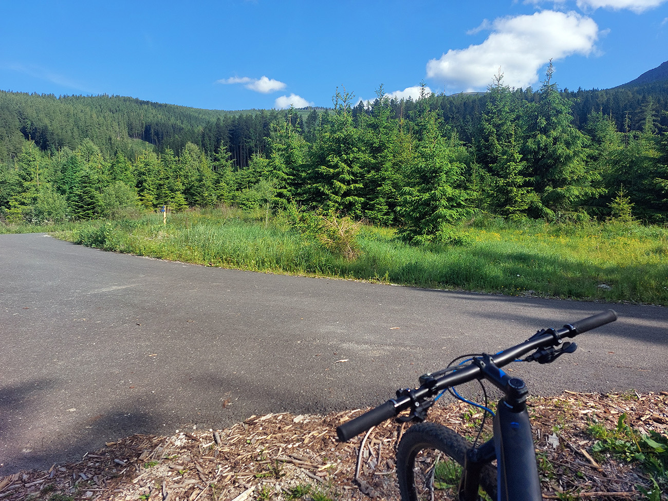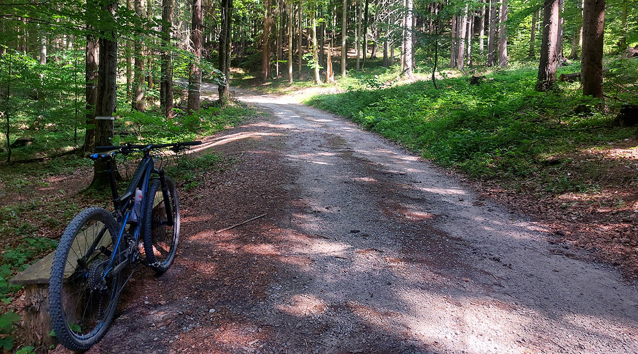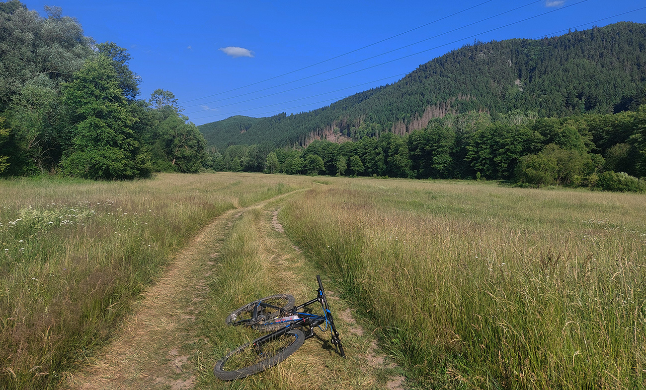 Už viem, že do BB dôjdem po vlastnej osi, otázka je len tá, kedy opustím šotoliny a pofrčím najkratšou cestou. Takže potrebujem rýchlu energiu – to znamená kofolu a nejaké horalky v prvej cukrárni na námestí. Po chvíľke už valím strmo hore okolo cintorína do doliny Drakšiar. Už je teplo, dobre padne tieň popri potoku. Aj potom v traverzoch, keď za altánkom opúšťam dno doliny, aby som si užil miestne lesné cyklotraily pod Skalkou.