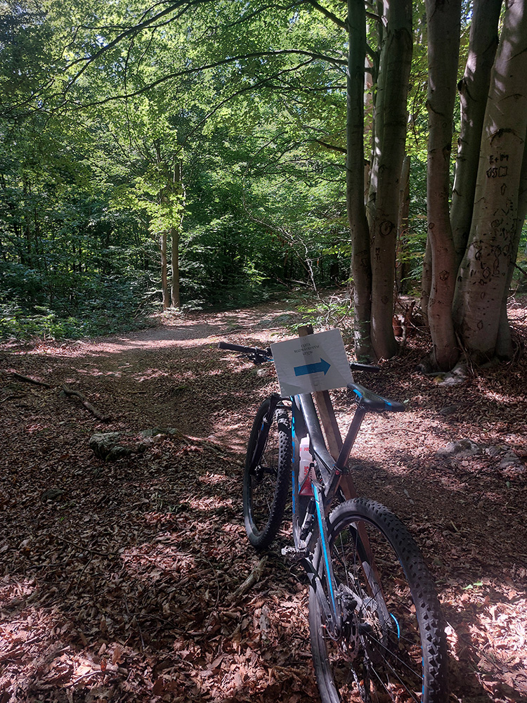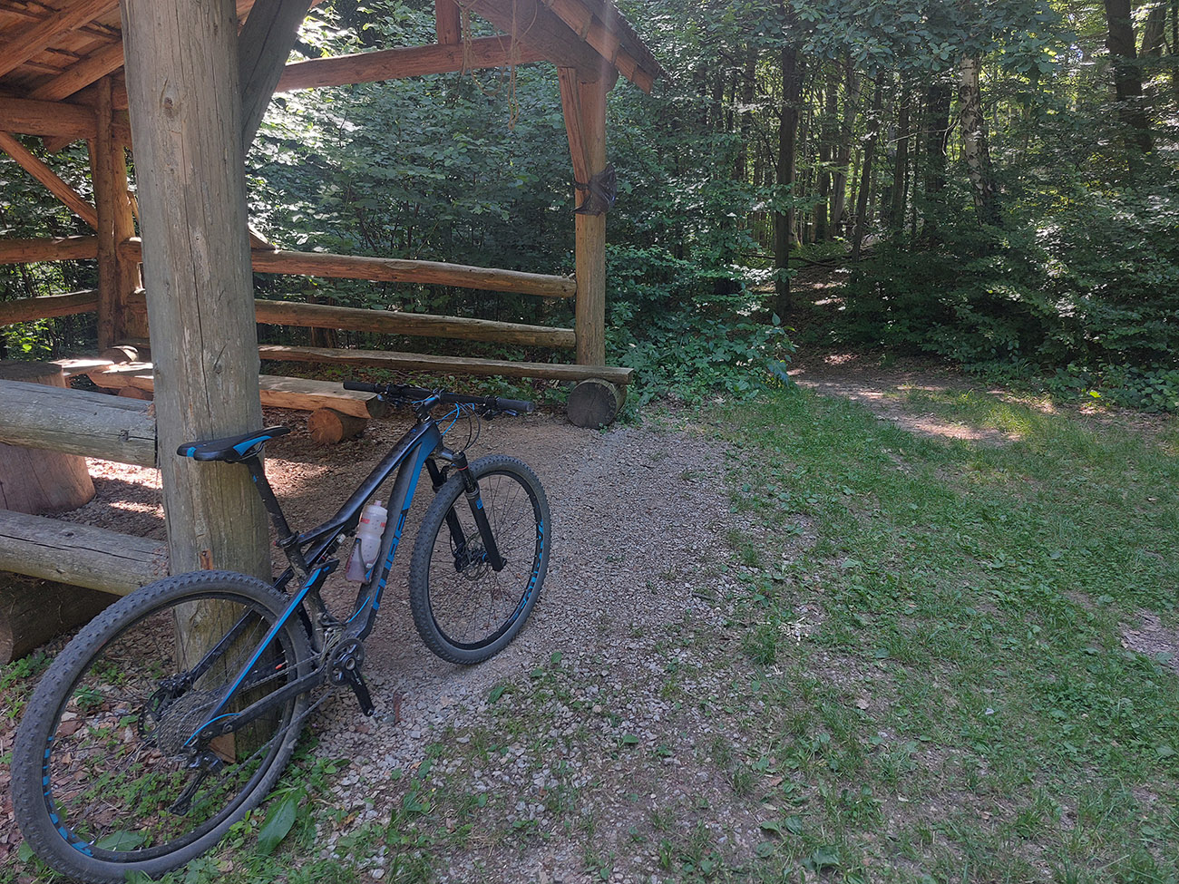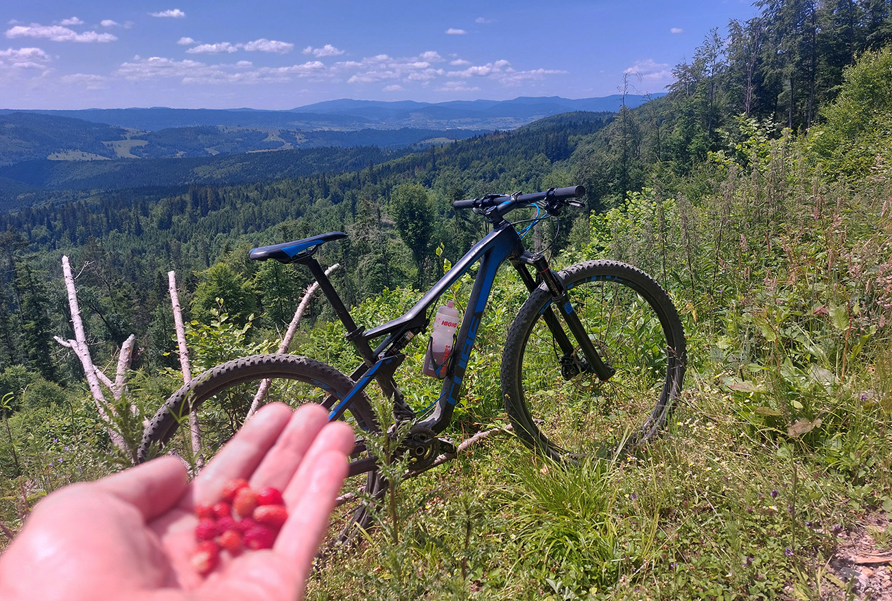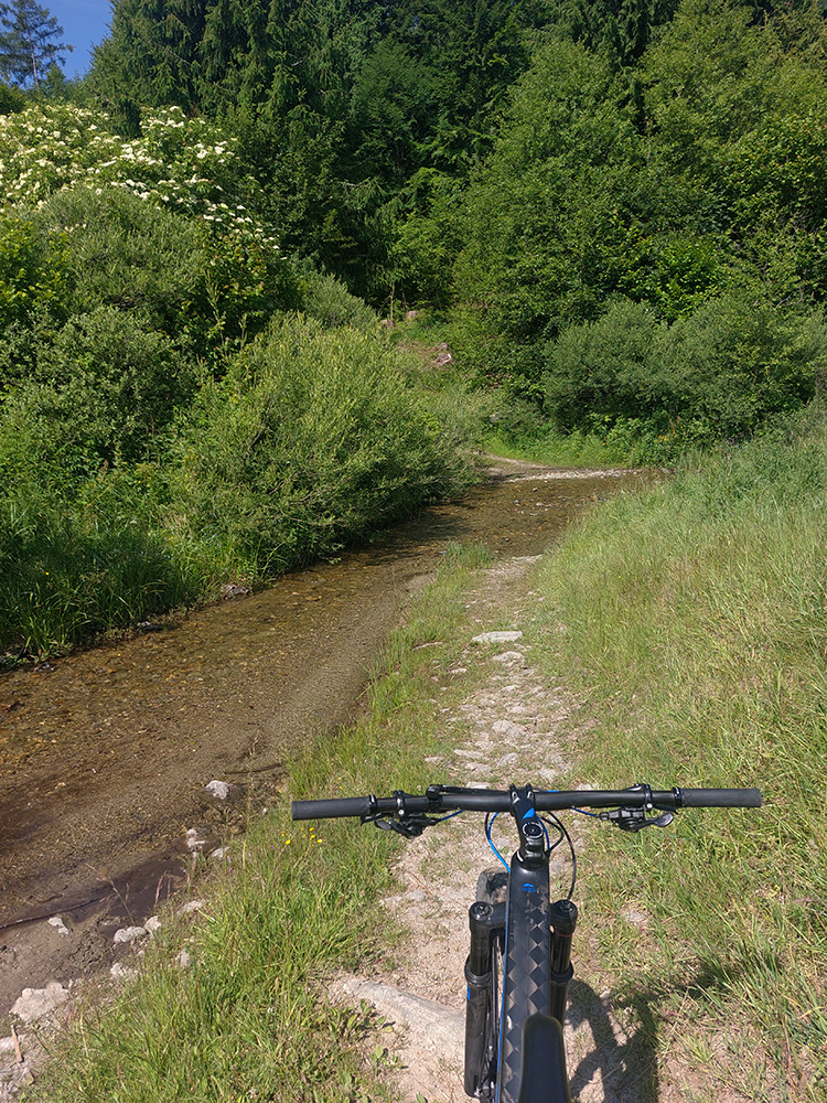 Už viem, že do BB dôjdem po vlastnej osi, otázka je len tá, kedy opustím šotoliny a pofrčím najkratšou cestou. Takže potrebujem rýchlu energiu – to znamená kofolu a nejaké horalky v prvej cukrárni na námestí. Po chvíľke už valím strmo hore okolo cintorína do doliny Drakšiar. Už je teplo, dobre padne tieň popri potoku. Aj potom v traverzoch, keď za altánkom opúšťam dno doliny, aby som si užil miestne lesné cyklotraily pod Skalkou.