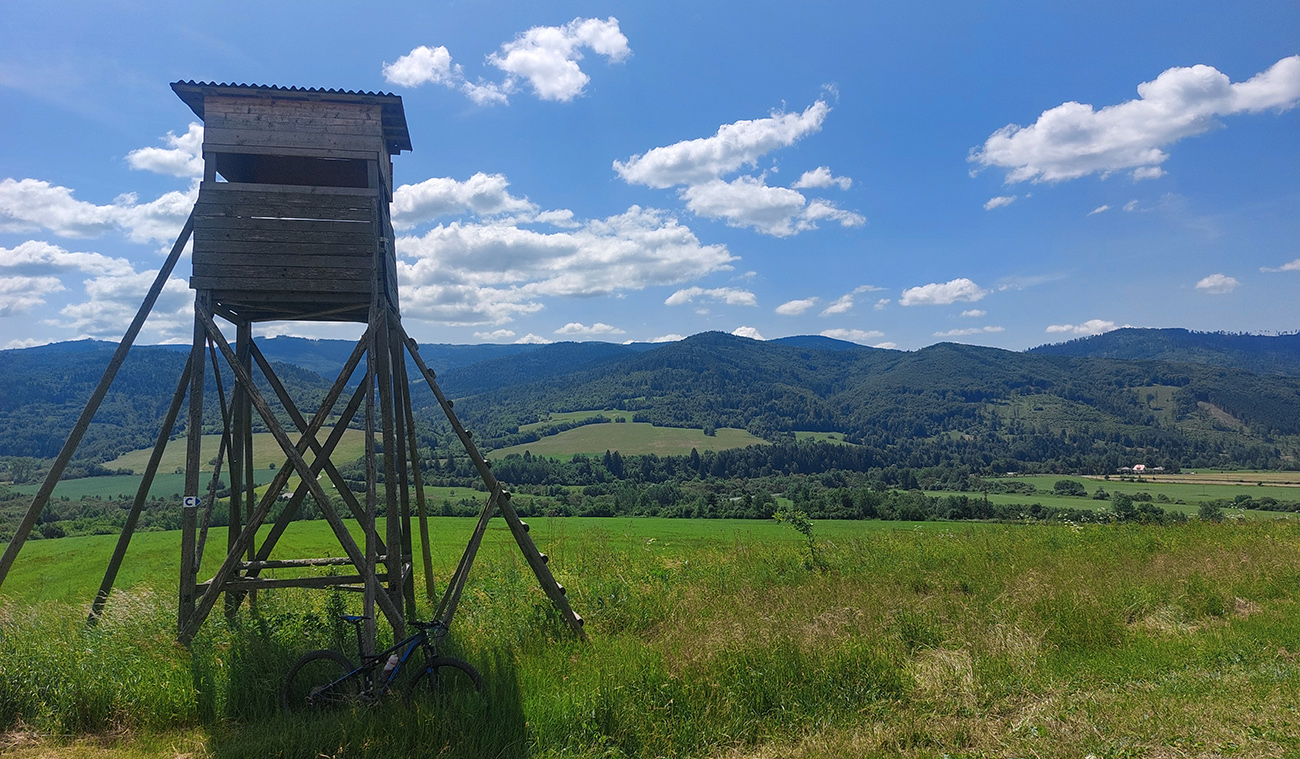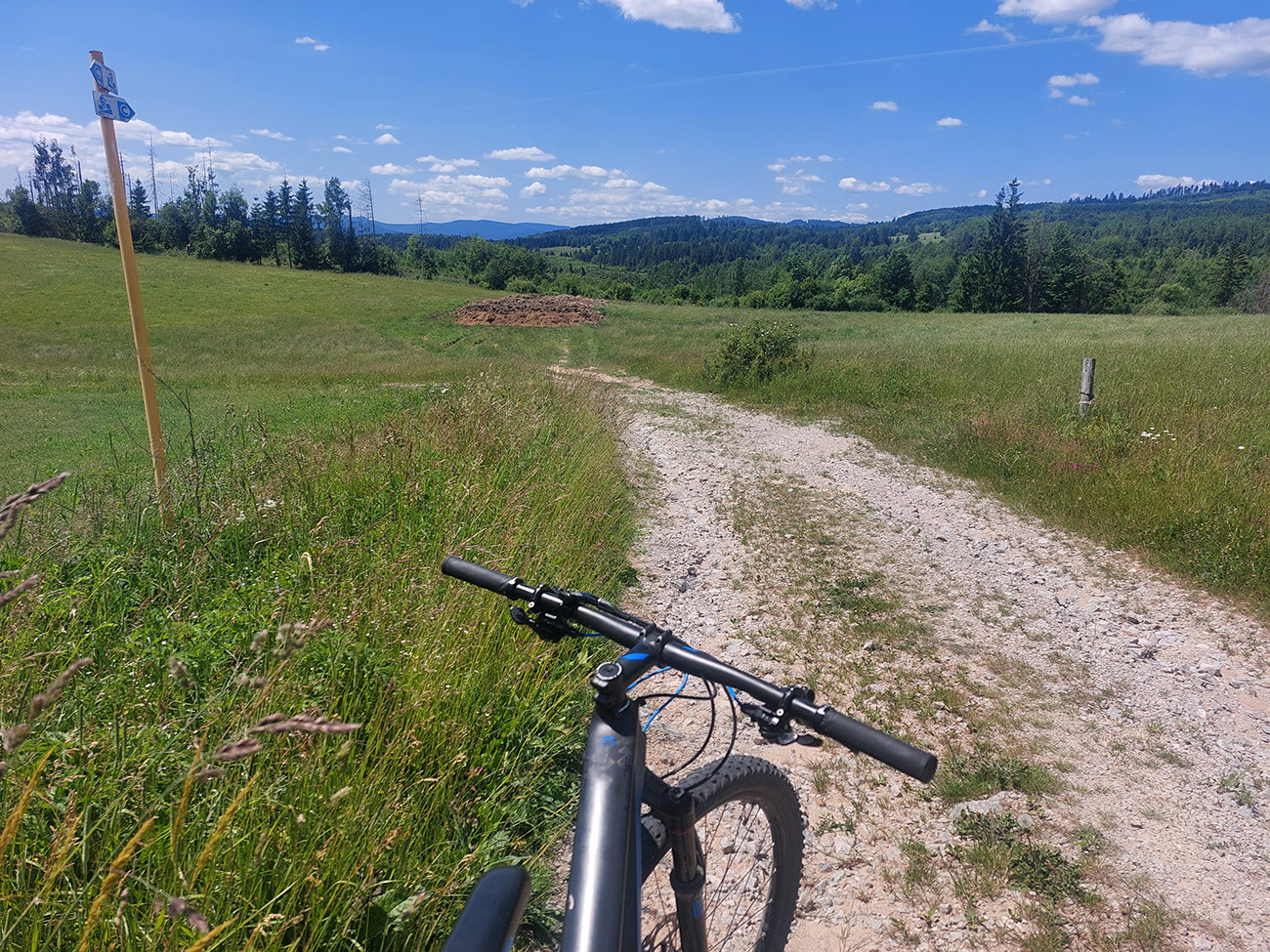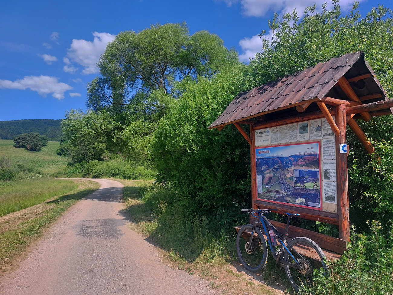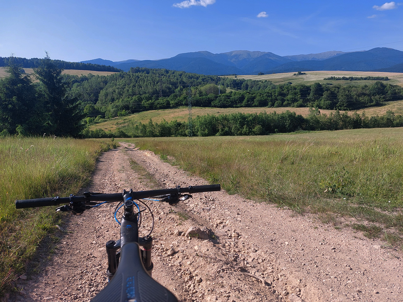 A zas tie široké panorámy – najviac sa do nich tlačí zjazdovka nad Polomkou, s rozhľadňou na vrchole. Vpredu v diaľke nezameniteľný Ľubietovský Vepor. Pod kolesami aj tu dominuje pohodlná a príjemne praskajúca šotolina, len pred Bacúchom na kuse taká nevýrazná, iba v tráve vyjazdená dvojstopa, okolo posedu.