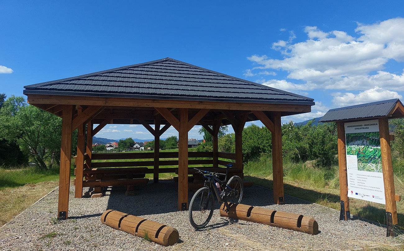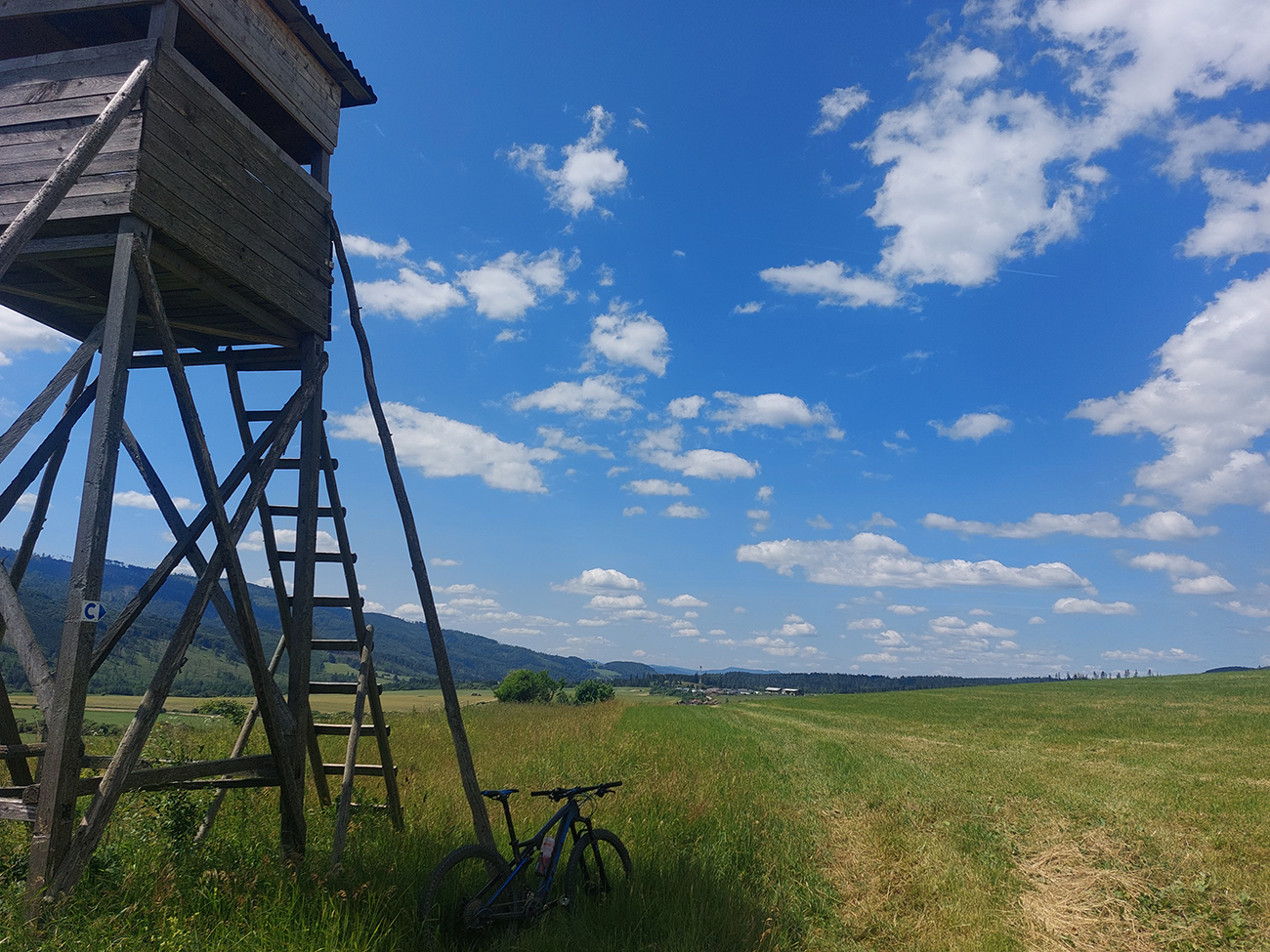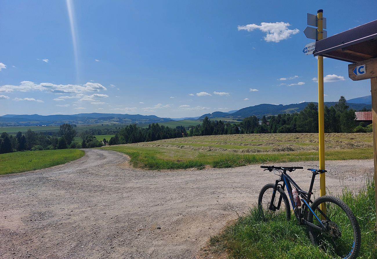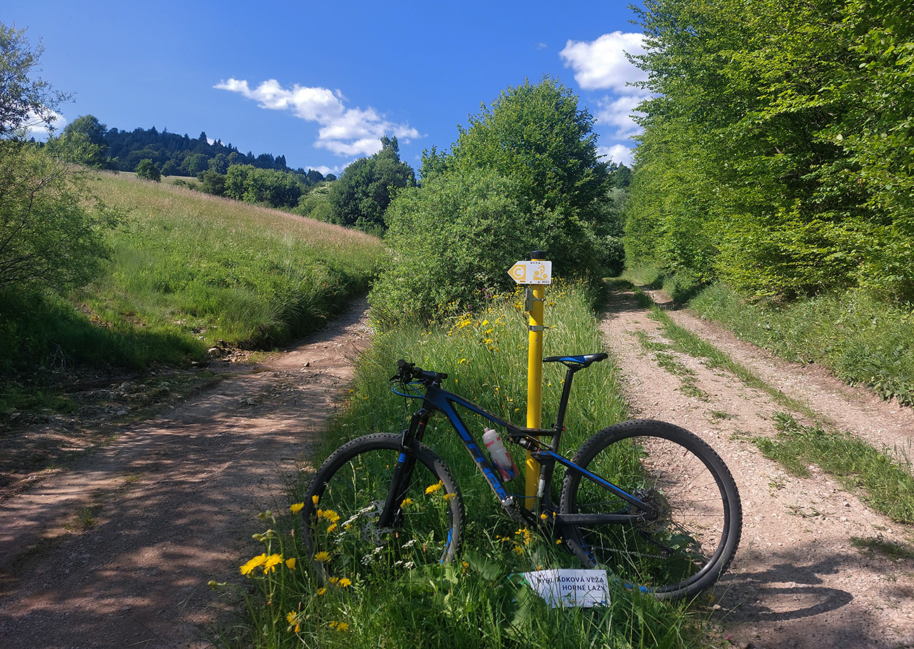 A zas tie široké panorámy – najviac sa do nich tlačí zjazdovka nad Polomkou, s rozhľadňou na vrchole. Vpredu v diaľke nezameniteľný Ľubietovský Vepor. Pod kolesami aj tu dominuje pohodlná a príjemne praskajúca šotolina, len pred Bacúchom na kuse taká nevýrazná, iba v tráve vyjazdená dvojstopa, okolo posedu.