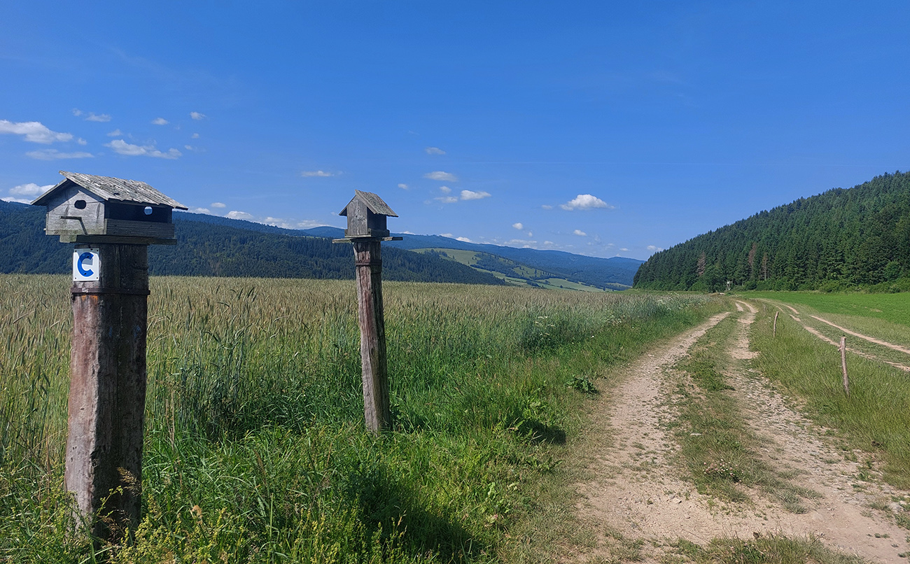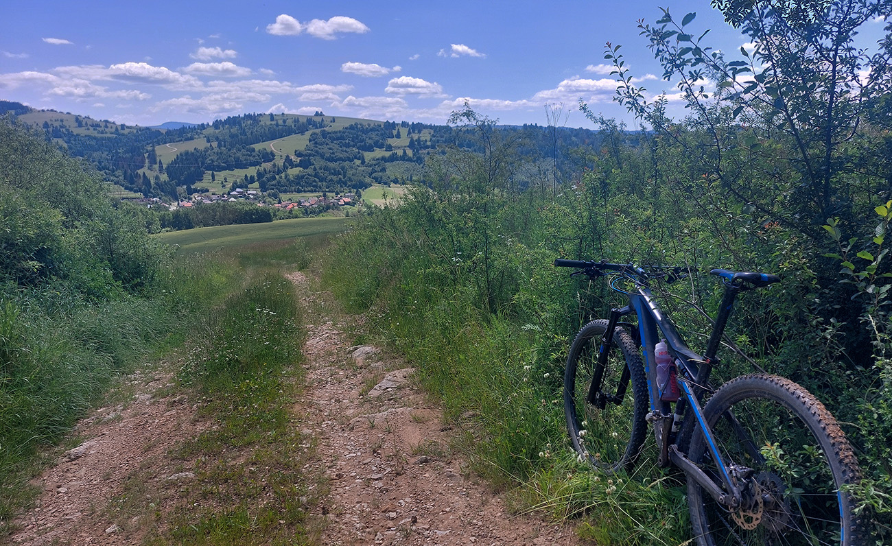 Minerálka dobre padla, lebo nasleduje strmšie, dlhšie stúpanie – našťastie v tieni lesa, aj keď okolo sa ťaží. Ale cesta dobrá a občas výhľad na jz – k Poľane a Vepru. Pred vrcholom povrch zoslušnie a v klesaní do Leňušskej doliny už zas komfort šotolinový. Na prvej odbočke doprava, kade sa dá obísť Braväcovo, ďalšia minerálka v altánku (tak tankujem z potoka), o kus nižšie druhá odbočka aj s cyklosmerovníkom (Pod Kyslou). Beriem tú a onedlho už po lúkach valím ponad dedinu, aj popri nejakej nechutne okázalej „miliardárskej haciende“.