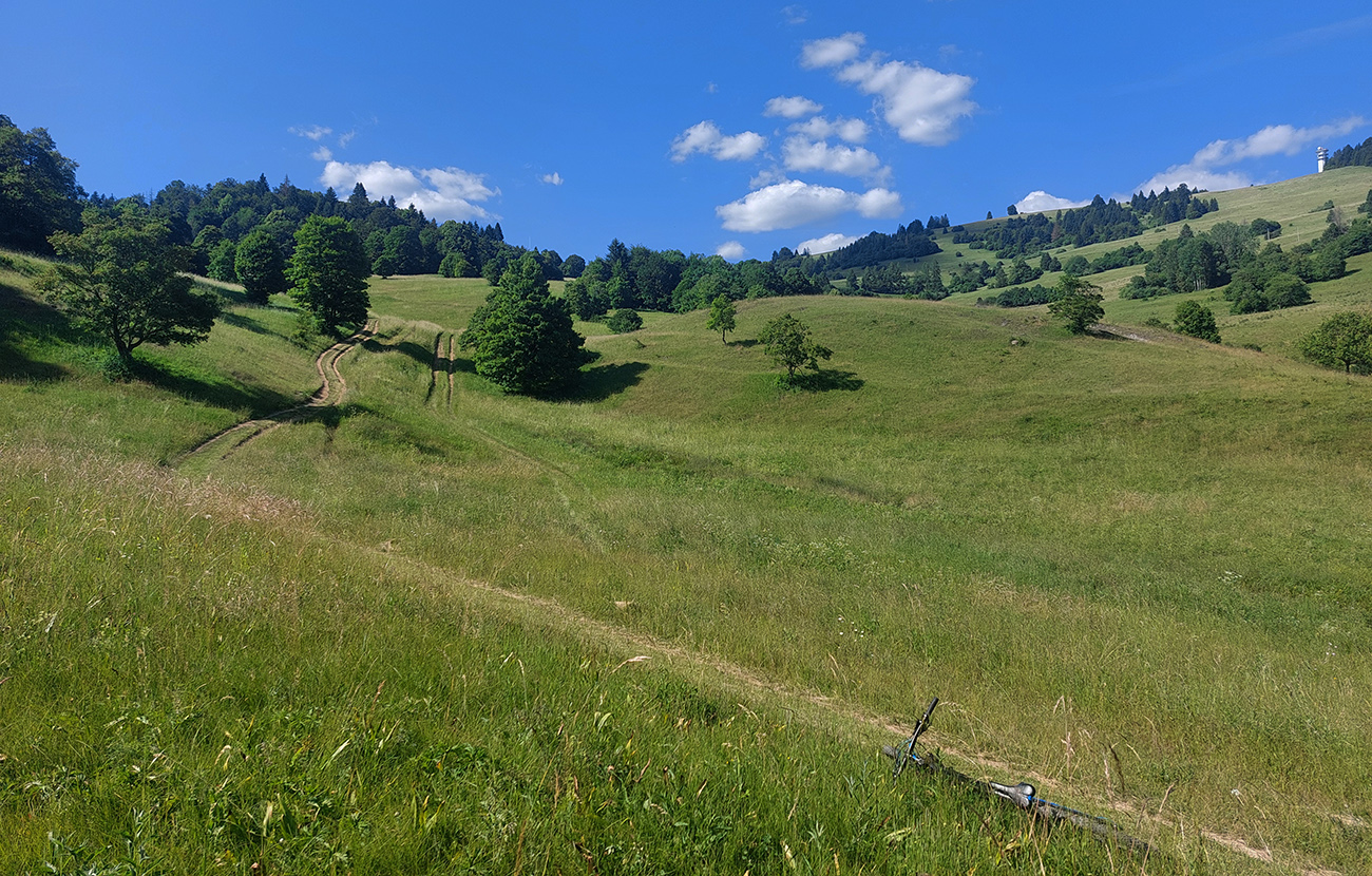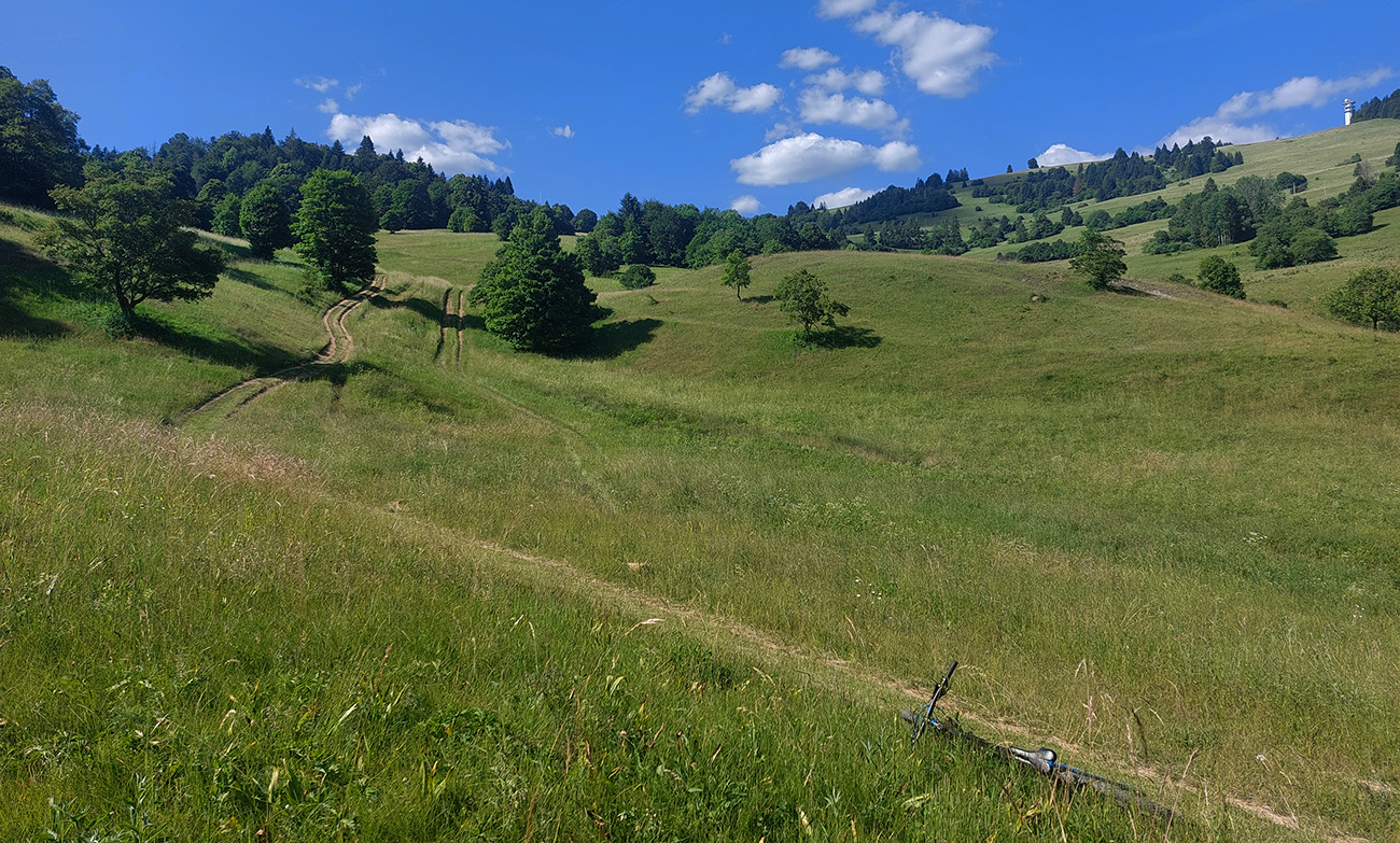 Za Braväcovom, pri cyklosmerovníku na lúčnej križovatke by to malo byť jasné: odbočka doprava a dole Lieskovskou dolinou. Lenže cesta nikde, iba tráva po pás. Cesta priamo sa stráca pod horou hnoja, pokračuje len cesta doľava. Síce vyzerá dobre, ale bliká mi varovná kontrolka – doma na mape sa mi niečo nezdalo. No riskujem a beriem tú. Vpredu cez dolinu vidím, kade budem stúpať z Filipova: