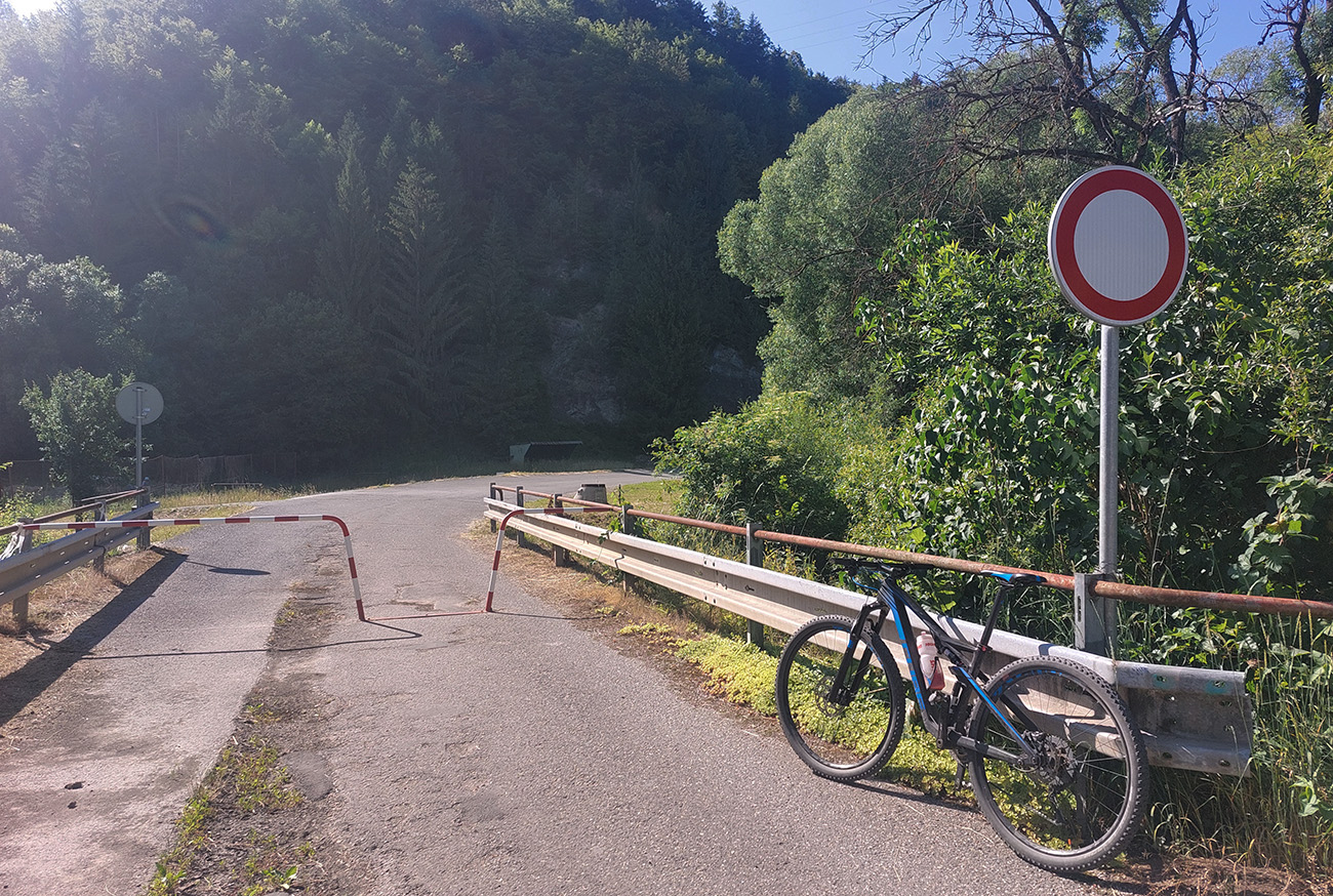 A tu prichádza problém. Cesta sa samozrejme stráca, do doliny strmina lesom, ale cez priesek už vidím domy a je tam úzky chodník poza plot. Síce super, ale radšej pešo. Napriek tomu – dole prázdna zadná guma. No nič – švihám, nech sa nezdržujem. Lenže tŕň ťahám von asi 20 minút, náhradná duša deravá (???) a lepidlo suché – takýchto sprostých náhod pokope som teda ešte nezažil. Samozrejme, že žobrem od domácich, ale kým vôbec prídeme na to, v čom je problém, zoženieme lepidlo a tak, hodina a pol preč. Aj som už myslel, že som došiel, tak vypínam hodiny. Takže potiaľto to vyzerá takto: