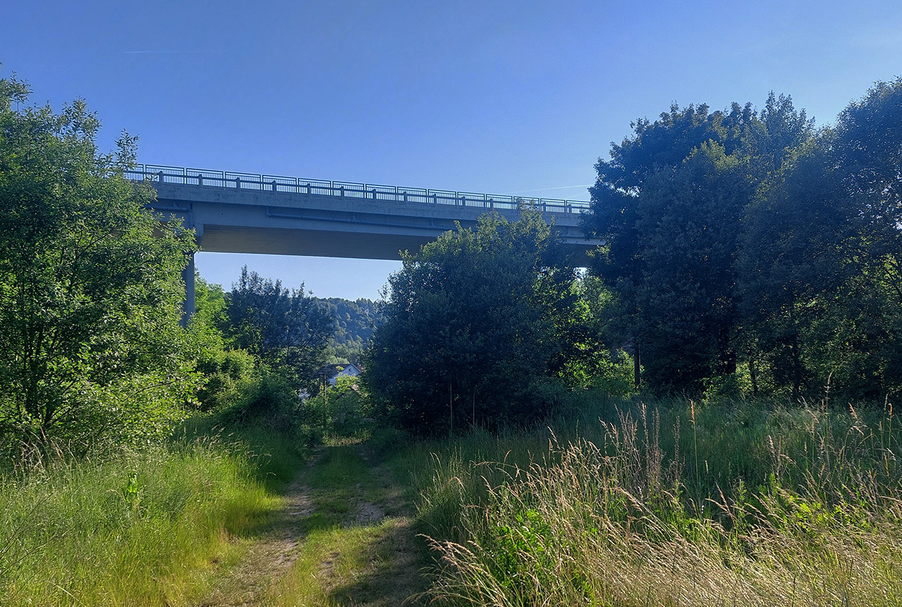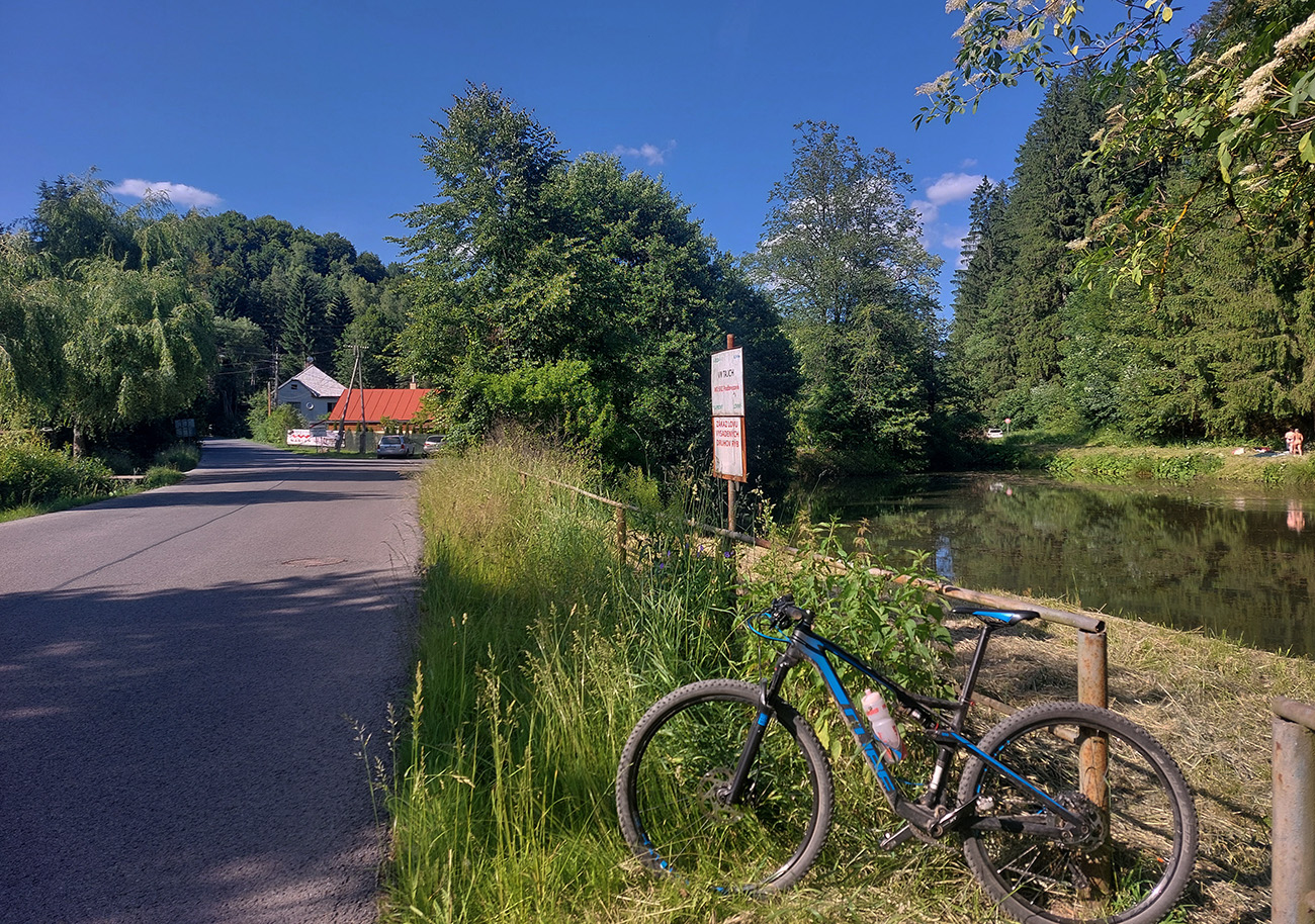 Trochu viac asfaltu cez Valaskú, ale bočnými uličkami. Potom poza fabriku na Piesku a poza posledné domy do veľmi pekného prejazdu cez lúčnatý (ako inak) Dolný diel, do susednej dolinky, k tajchu Bruchačka. A tam som zvedavý na ďalšiu vymyslenú improvizáciu. Lebo na mape cesta žiadna, ale na leteckej snímke to vyzerá dobre!