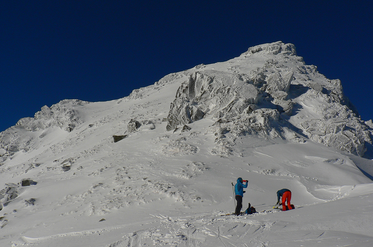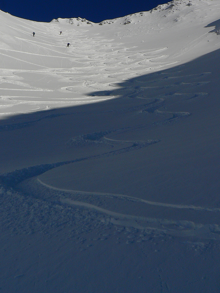 Lyžba nazad pod sedlo z vrcholu nič moc, na pohľad síce v prášku, ale podľa škrípavých zvukov spod lyží po ľade. Prášok sem tam aj niečo tvrdšie ako ľad ukrýva, takže opatrne treba. Pod hangom už je to lepšie, ale chce to pevnú obuv, hustota snehu a aj jeho ochota chytať lyže rôznou silou sa mení veľmi rýchlo.