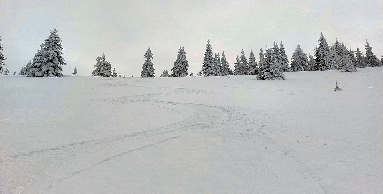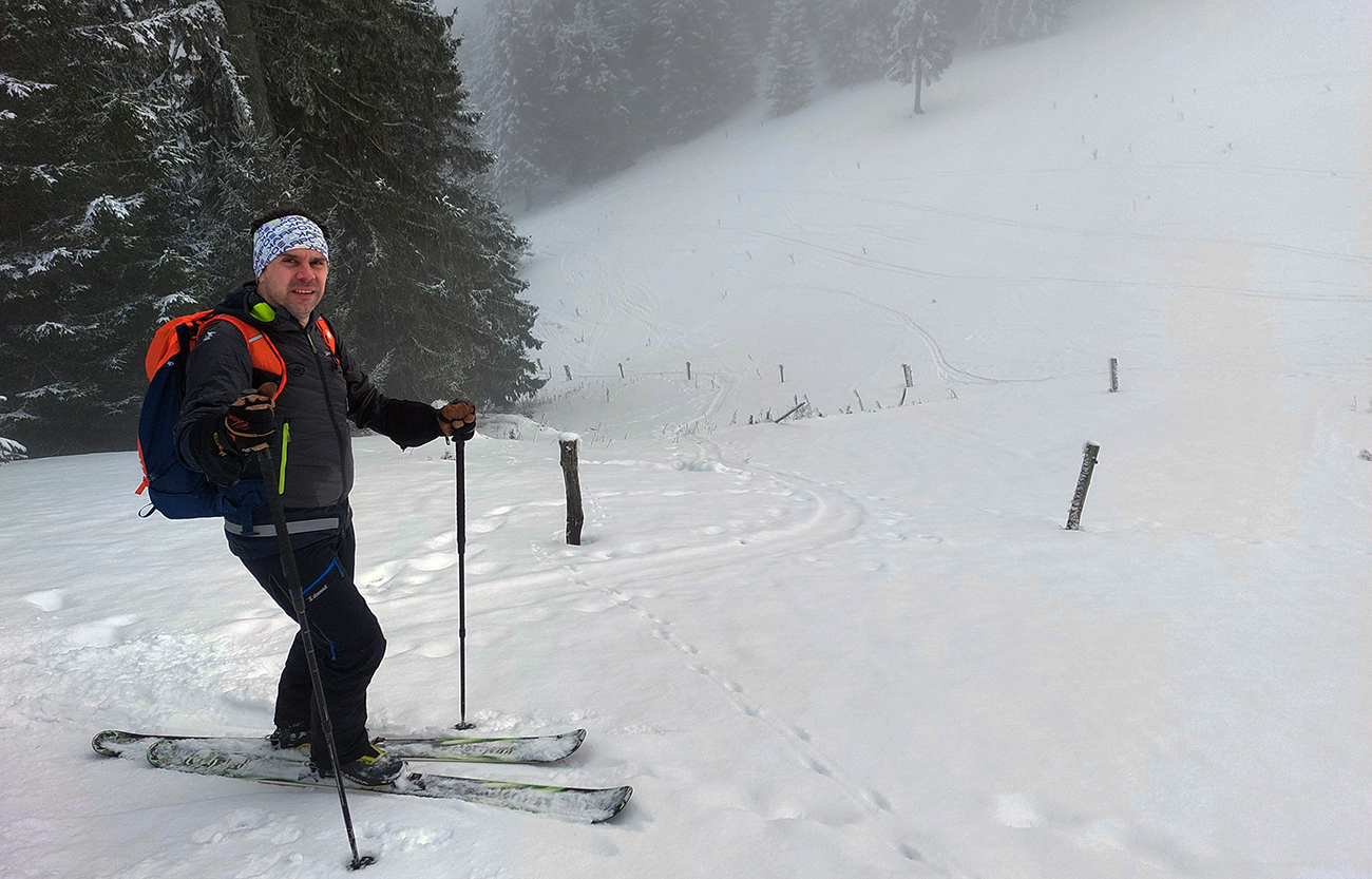 Na „otočke“ sa hmla na chvíľu odporúča, tak rýchlo využívame a skúšame pár oblúkov dole lúkou. Dobré to je na túto biedu – na pevnom a drsnom firne nejaký cenťáčik nového snehu. Síce to škrípe, ale aj drží. Spúšťame až medzi stromy a keď už je úzko a strmo, otáčame nazad hore.