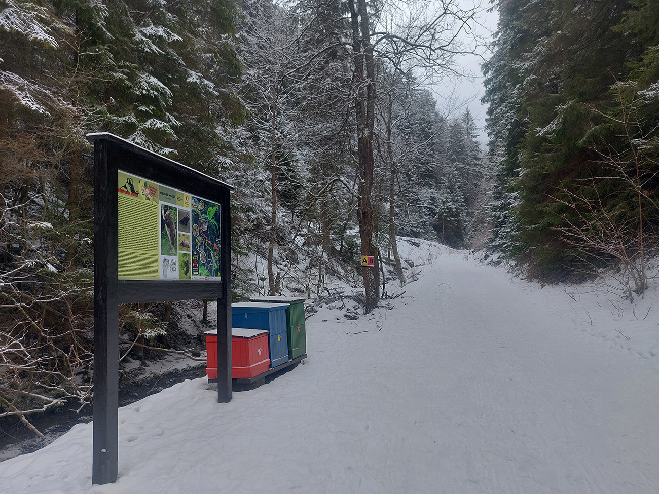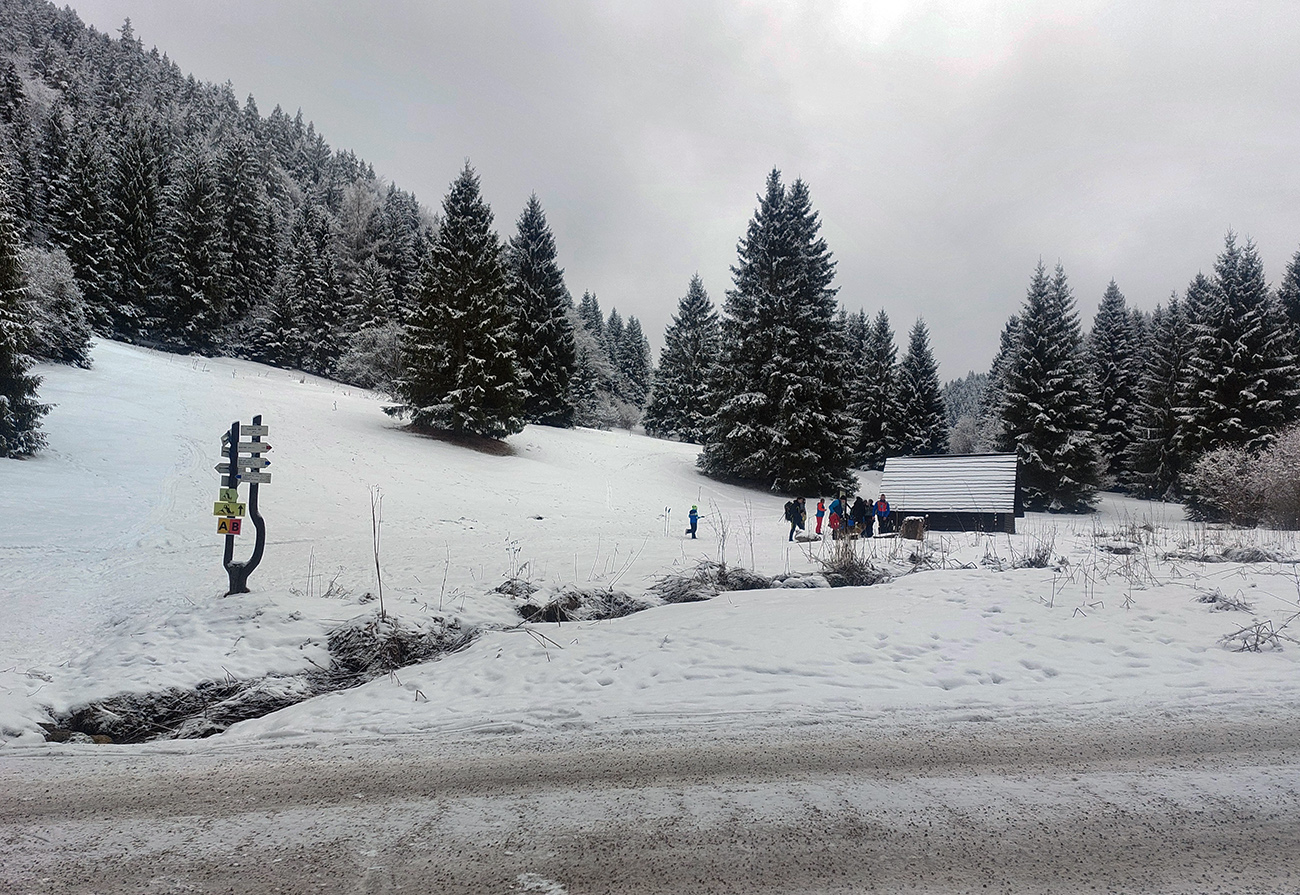 To už sme v mlieku a cestou po cyklotrase pod Šiprúň obzeráme mega dlhé námrazové ihličky na každom konári. Krajina omrznutá ako v rozprávke. Občas sa to niekde so šuchotom zosunie.