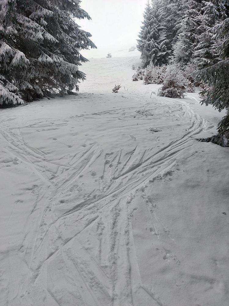 A na záver klasika – využívajúc kopy (lyžami nastrúhaného) kryštálového cukru na okrajoch inak parádne ľadovej zjazdovky, fičíme v pohode až dole, slalom pomedzi ľudí. Na rozchodenie do sezóny vraj bohato stačilo, aj zajtra je deň a to už čakajú Tatry!