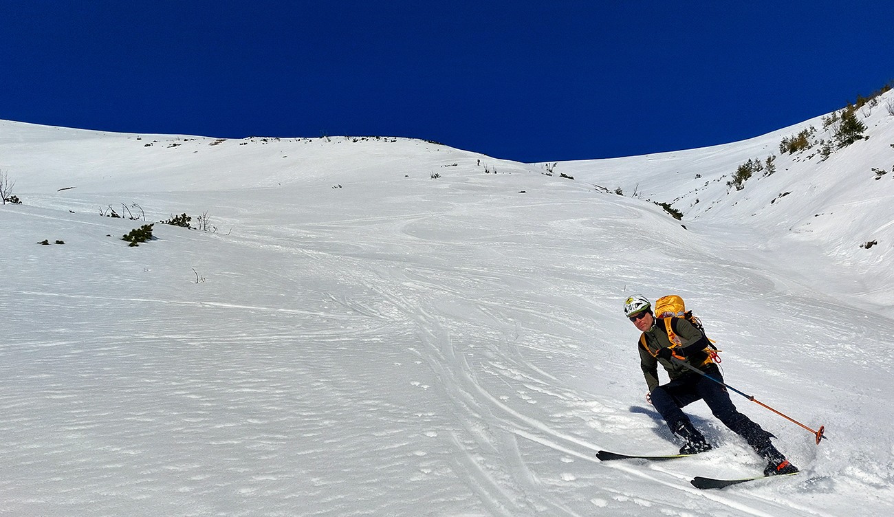 Výšľapy boli aj celkom výživné v tom teple, tak teda že mizneme do tieňov a domov. Takže sme sa prepotácali po hrebeni na Dereše a takmer z ich vrcholu sme to rubli kúsok dole po severnom rebre medzi východným a stredným kotlom – aby sme zatočili doprava, do hlbokej modrej polotmy vari hneď druhého žľabu.