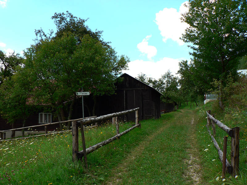 V osade staré drevenice a nová betónová (!!!) cesta. Vysvetlenie za rohom – stádo nových „chalúpok“, o akých sa Jurajovi J. ani nesnívalo, tak cestu potiahli aj k starým chalupám. Tu je jediná dilema na celej trase – pomedzi novostavby ešte nezaznačili cyklotrasu. Mapa pomohla a už sa štverám k osade Kýčera.