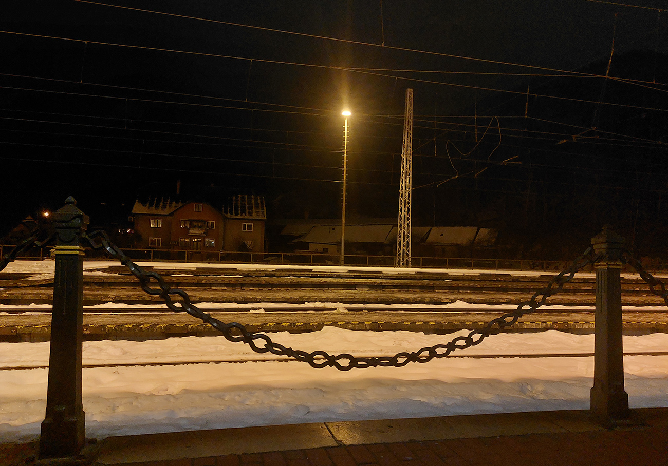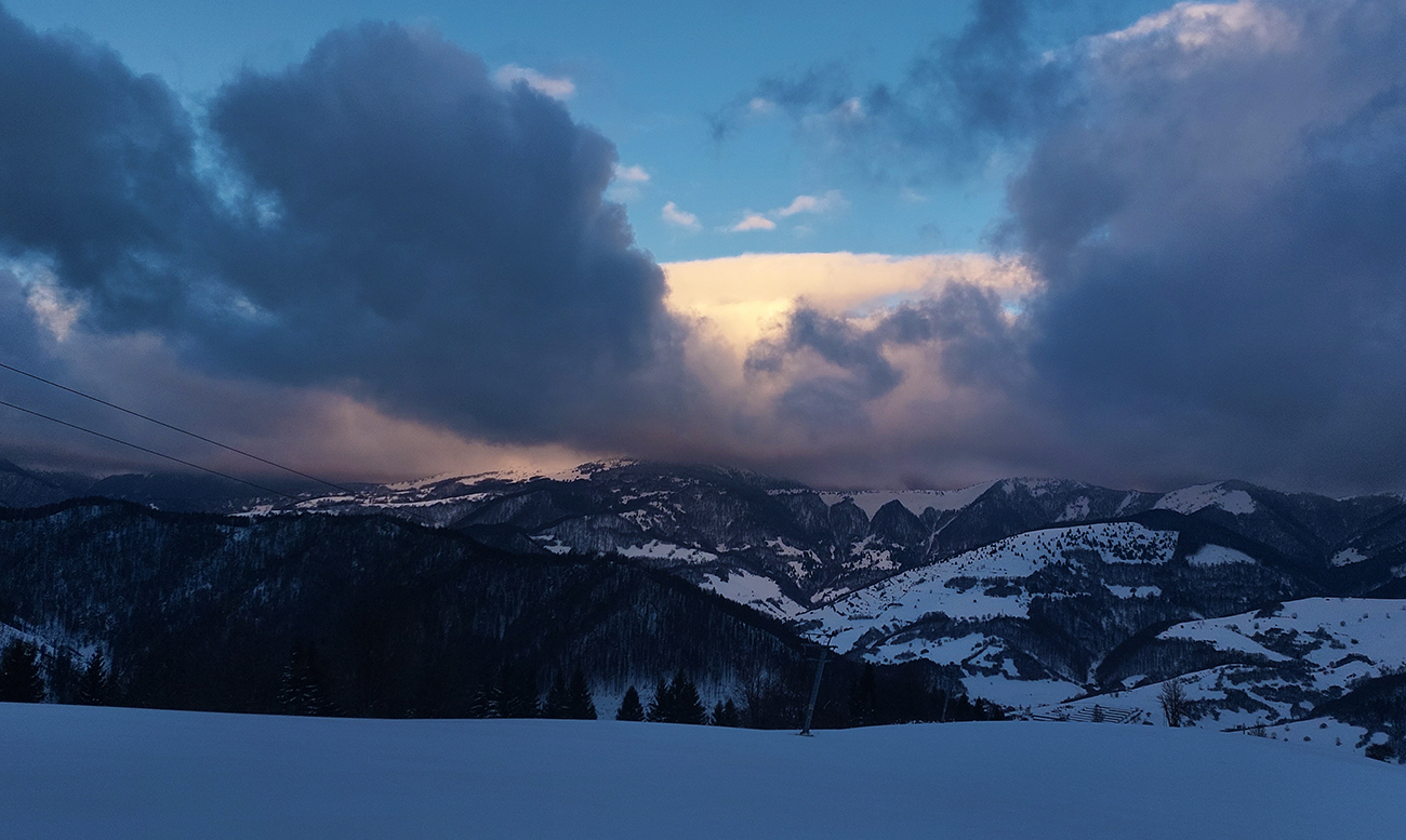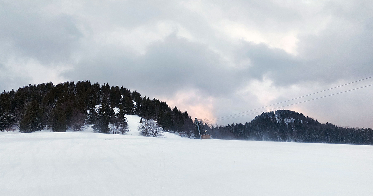 Traverz popod Končitú aj horelesík na Malý Zvolen: preparádne stopy (aj dole to pôjde bezpečne), nič netrčalo. Hole hore na hrebeni samozrejme vylízané, ale nie tragicky, už sa čosi ulepilo na tie trávy a stačilo to. Ránu sa akosi nechcelo rozvidnieť, len na juhu Poľana ako keby chŕlila hromady žeravého popola. A vo Zvolenskej kotline to vyzeralo na slnečné, jarné ráno :-) Inak zdola z dediny mi pásy moc nenavlhli a hore moc nezamrzli, tak aj v tom spokojnosť. Čiže prvá lyžba, zo Zvolena dole lúčkami a do lesa, po červenej turistickej, až na výstupovú trasu A/B. Pod krížom jasné, že hnusný prevej, bolo treba kus vedľa začať, popod hornú stanicu lanovky. Zato aj fajné oblúky sa spočiatku v tom hlbokom, hutnom, rovnomerne hustom snehu dali povykrajovať – miesta dosť. Nižšie už rozrýľovaný tankodrom.
