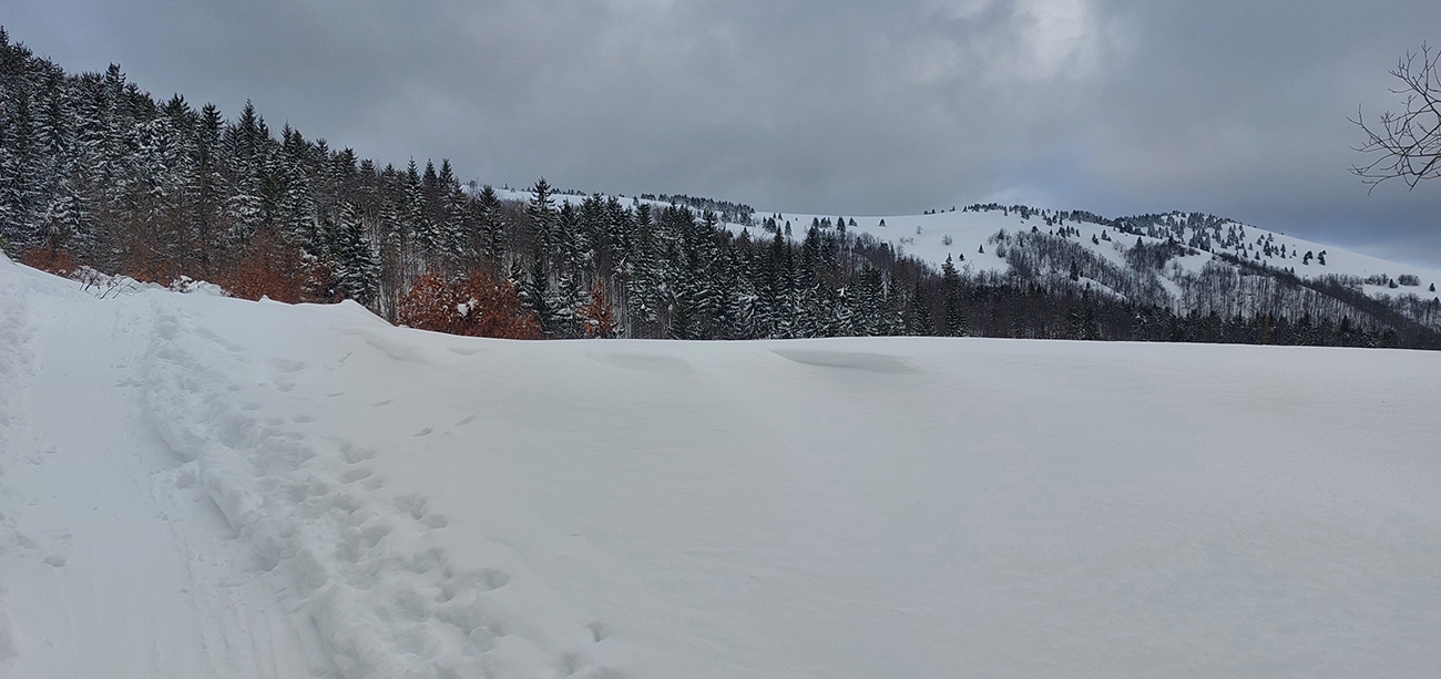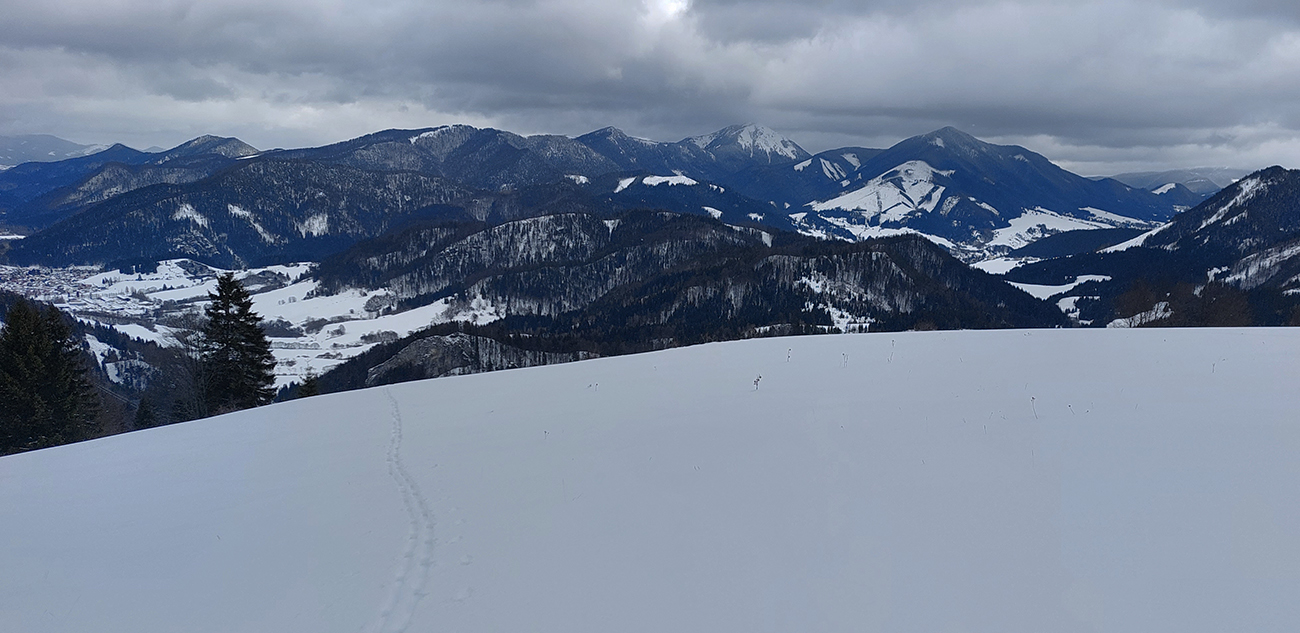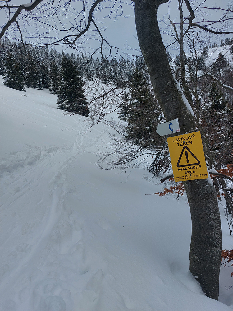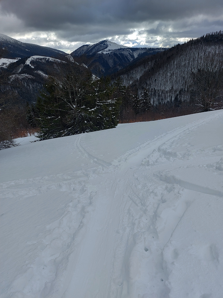 Aj Céčko samozrejme vyleštené a vytvrdené – miestami až pásy začali pišťať, akoby som ich na ľade trápil. V závere výstupu lúky pod hrebeňom mierne polyžované, stopa hlbokánska. Napriek výhľadu doprava cez dolinku, kde sa na hranici lesa zubil samovoľný odtrh, tu to vyzeralo bezpečne. Tak keď som vyliezol na hrebeň, potiahol som kúsok nazad smerom na Zvolen a podarilo sa mi trafiť tú správnu medzeru medzi stromami – parádna lyžovačka, až dole do jamy, na kraj lesa. A stopa odtiaľ hore superkomfortná - no vrelá vďaka za ňu!