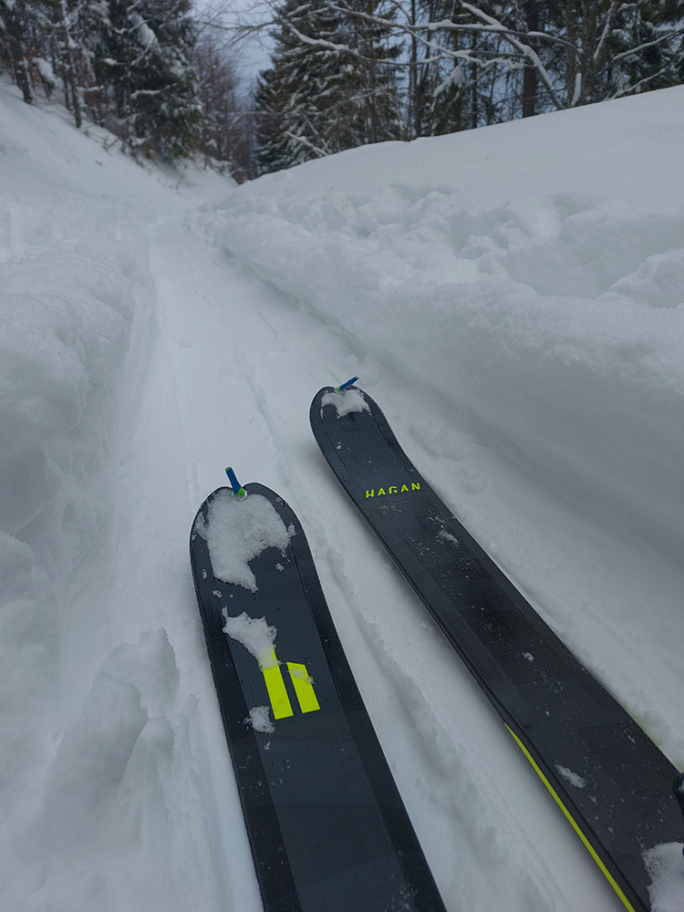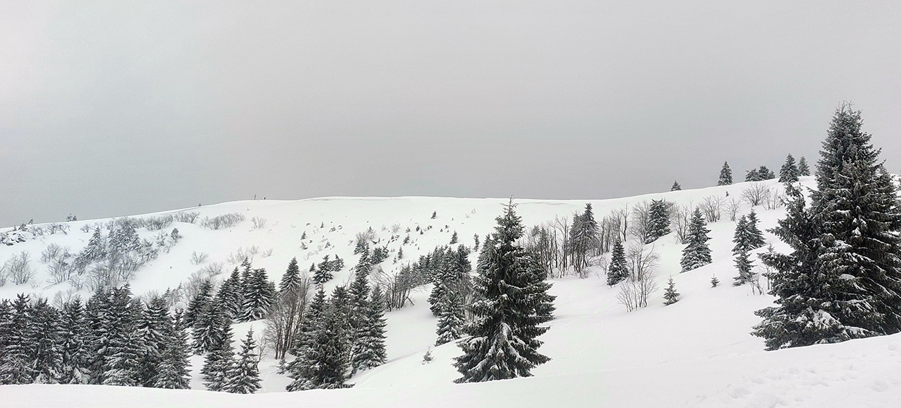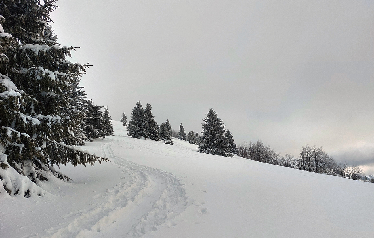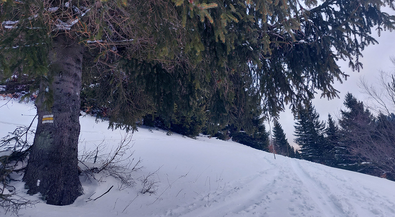 Aj Céčko samozrejme vyleštené a vytvrdené – miestami až pásy začali pišťať, akoby som ich na ľade trápil. V závere výstupu lúky pod hrebeňom mierne polyžované, stopa hlbokánska. Napriek výhľadu doprava cez dolinku, kde sa na hranici lesa zubil samovoľný odtrh, tu to vyzeralo bezpečne. Tak keď som vyliezol na hrebeň, potiahol som kúsok nazad smerom na Zvolen a podarilo sa mi trafiť tú správnu medzeru medzi stromami – parádna lyžovačka, až dole do jamy, na kraj lesa. A stopa odtiaľ hore superkomfortná - no vrelá vďaka za ňu!