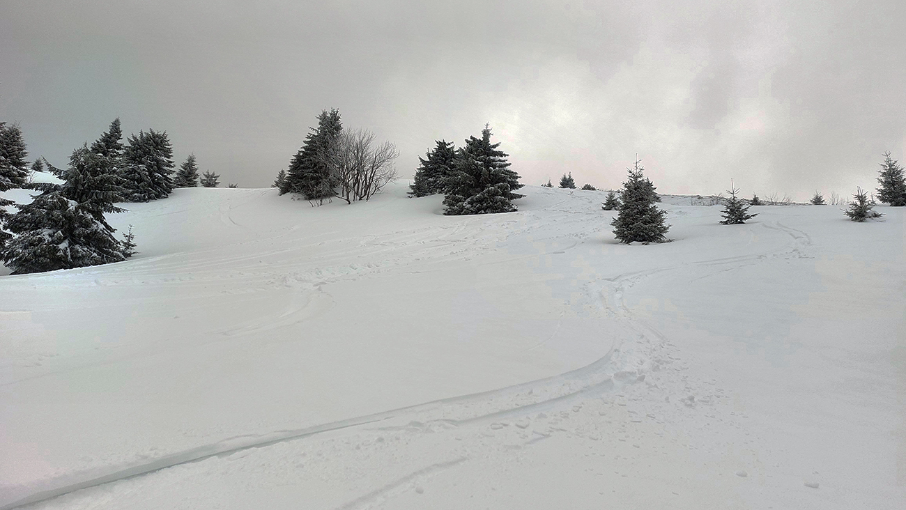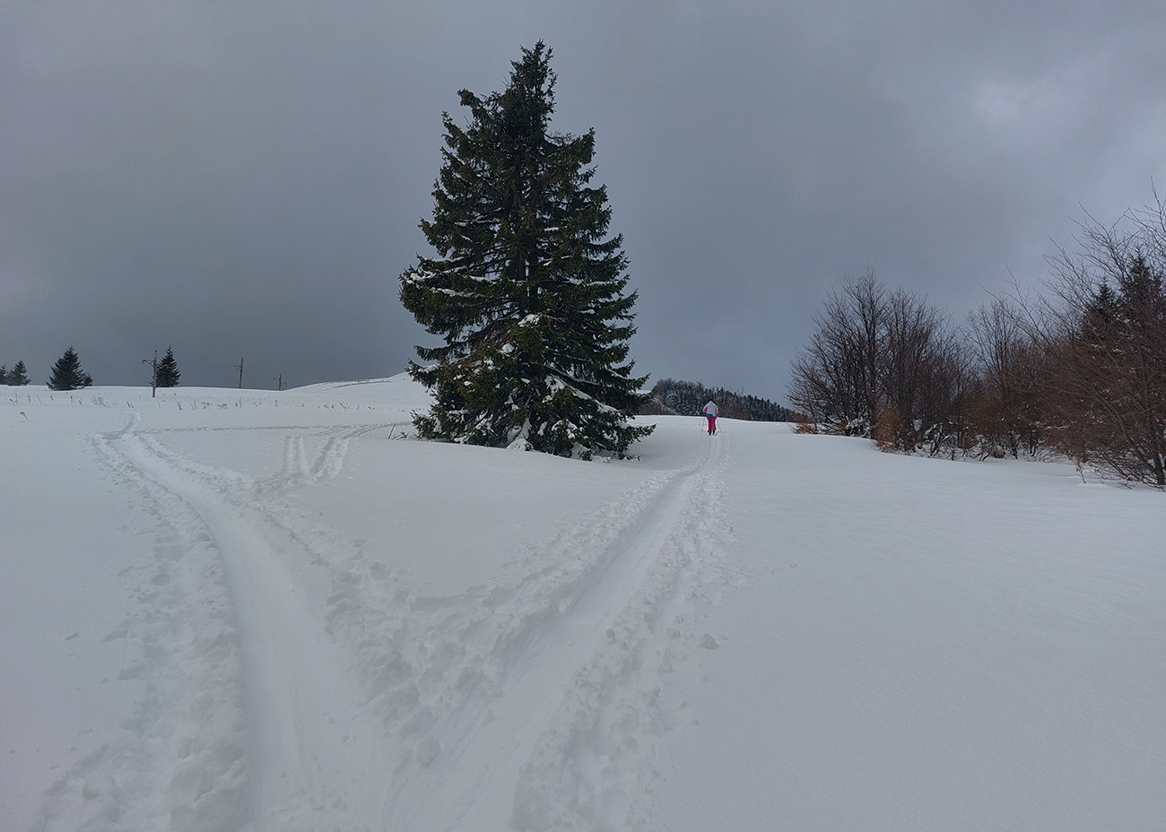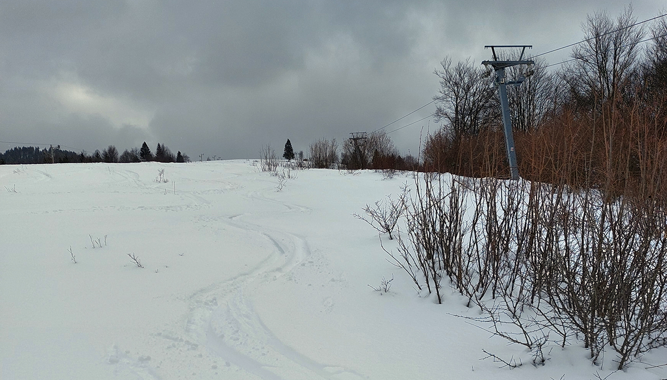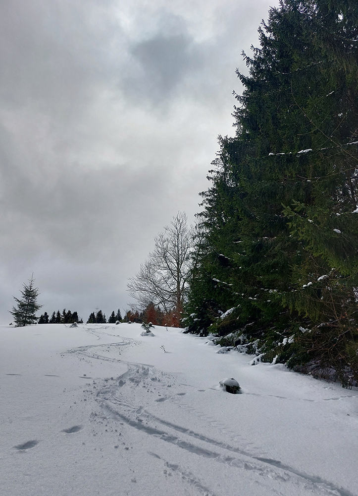 Na výstupových trasách už začínala hustnúť premávka, Áčko aj Béčko v lese pekne vyleštené, nad lesom vietor nestíhal stopu prifukovať. Druhý raz pri kríži a druhá ani nie lyžovačka, skôr traverzovačka krížom cez zjazdovky. Aj menčester som si užil, aj pár voľných oblúkov a na záver pod zrušeným vlekom znovu aj hlbokú a hustú duchnu, až do lesa. Až dole na výstupovú trasu C.