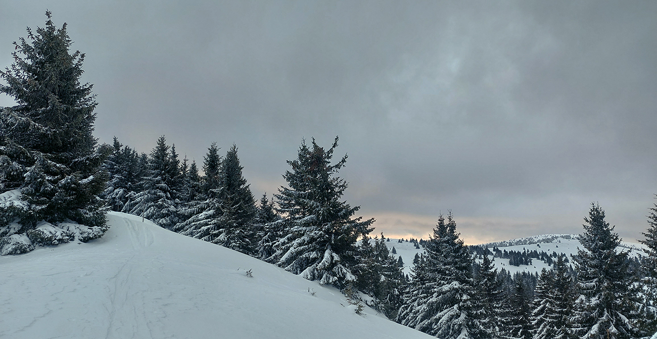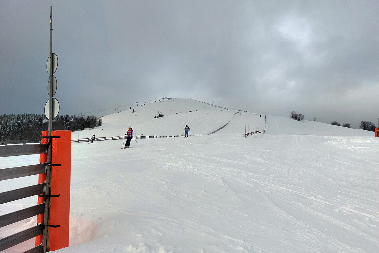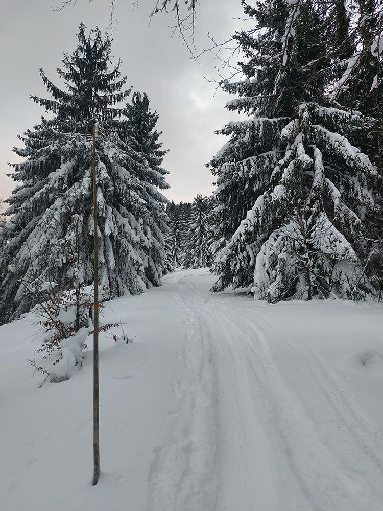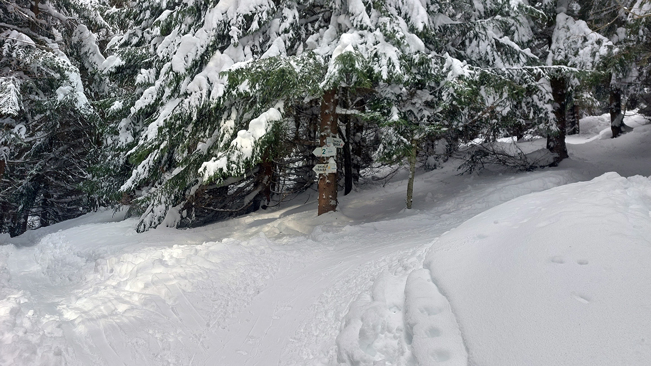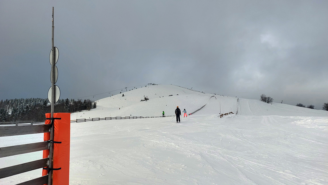 Na výstupových trasách už začínala hustnúť premávka, Áčko aj Béčko v lese pekne vyleštené, nad lesom vietor nestíhal stopu prifukovať. Druhý raz pri kríži a druhá ani nie lyžovačka, skôr traverzovačka krížom cez zjazdovky. Aj menčester som si užil, aj pár voľných oblúkov a na záver pod zrušeným vlekom znovu aj hlbokú a hustú duchnu, až do lesa. Až dole na výstupovú trasu C.