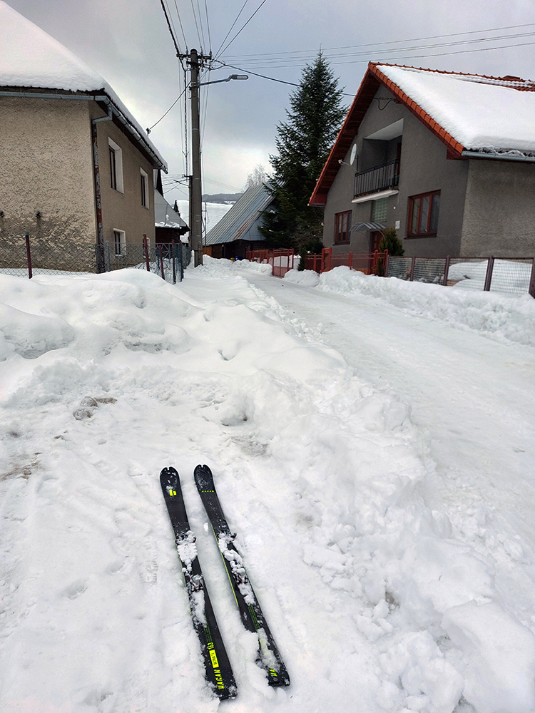 No ale naspäť ako? No ťažko - výživný telocvik! Ale mierne polyžované to tu už bolo, tak som si miestami pomohol svojou aj cudzími stopami. Až kým som sa pod vrcholom nedostal do výstupovej stopy po predjazdcoch, aj im patrí moja vďaka! Lebo zabáral som sa tak 15 čísiel, paličky však často aj 30 – 40. A do vlhkého, no radosť, ale stálo to za to. Hore som už ani ku smerovníku nešiel, točil som doprava pomedzi stromky rovno do zjazdu pod Končitú. Ako som si pri výstupe myslel, komfort to bol aj vykrúcať sa a brzdiť v užších miestach, dosť toho ležalo na zemi. A dole na zjazdovke miesta habakúúúk, tam som si našiel aj vlastný, nepočmáraný kúsok lúky, tak už len veselo a najmä kľukato až dole, medzi domy.